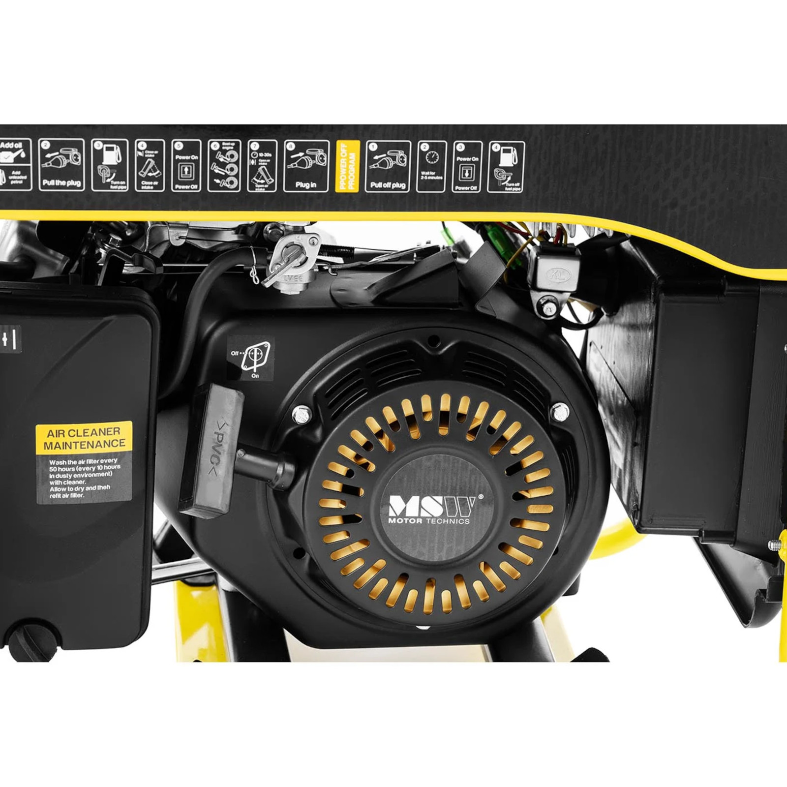 Agregat prądotwórczy inwertorowy marki MSW oferuje niezawodne źródło zasilania 230 V AC, które sprawdzi się na placu budowy, w dużym warsztacie, a nawet w przemyśle. Agregat na benzynę jest idealnym źródłem zasilania w podróży dzięki swoim rozmiarom i wytrzymałej ramie. Posiada silnik o mocy 4200 W. Zbiornik mieści 5 l. Silnik benzynowy charakteryzuje się wysoką sprawnością energetyczną, dzięki czemu zużywa tylko 374 g/kWh. Uruchamiany jest ręcznie za pomocą linki. Dzięki zapłonowi TCI jest od razu gotowy do użycia. Pomimo wysokiej wydajności urządzenie charakteryzuje się niskim poziomem hałasu wynoszącym zaledwie 97 dB. Agregat pozwala zasilać urządzenia o napięciu 230 V AC, takie jak wiertarki elektryczne, narzędzia szlifierskie, ale także sprzęt kuchenny czy źródła światła. Generator prądu z regulatorem napięcia AVR przekonuje stabilną mocą wyjściową bez dużych wahań napięcia. Dzięki dwóm złączom możesz korzystać ze źródła zasilania dla kilku urządzeń końcowych jednocześnie. Zabezpieczenie przed przeciążeniem zapewnia bezpieczną pracę.