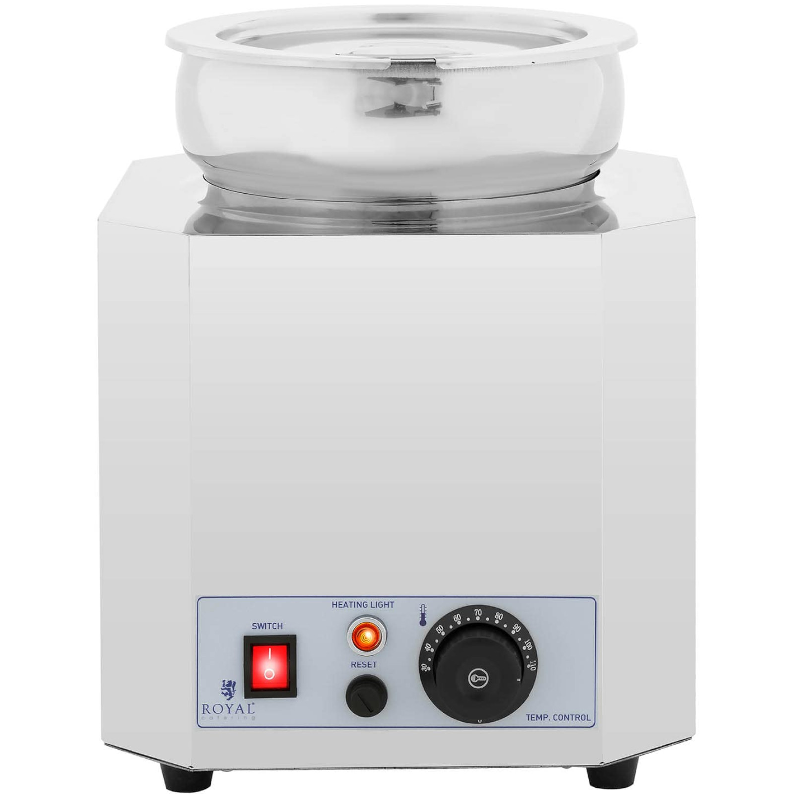 Stacja do zupy marki Royal Catering sprawdzi się w restauracji, jadłodajni czy małej gastronomii do utrzymywania w cieple zup, gulaszów, sosów, czekolady czy kremowego serowego fondue. Stacja wyposażona została w okrągły garnek o pojemności 7 l i dopasowaną pokrywkę. Temperatura regulowana jest w zakresie 30-110°C za pomocą pokrętła. Moc podgrzewacza wynosi 500 W. Bemar działa jako system zamknięty i nie musi być napełniany wodą. Podgrzewacz wykonano ze stali nierdzewnej, jest trwały, wytrzymały i łatwy w czyszczeniu.
