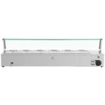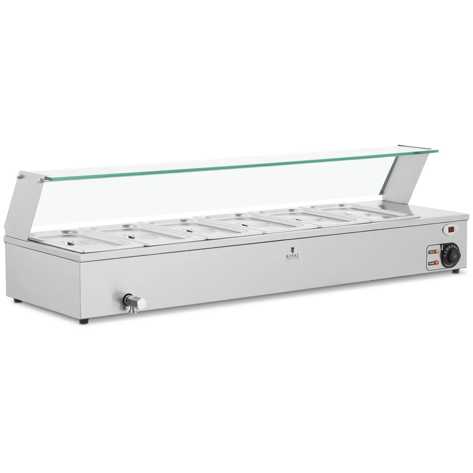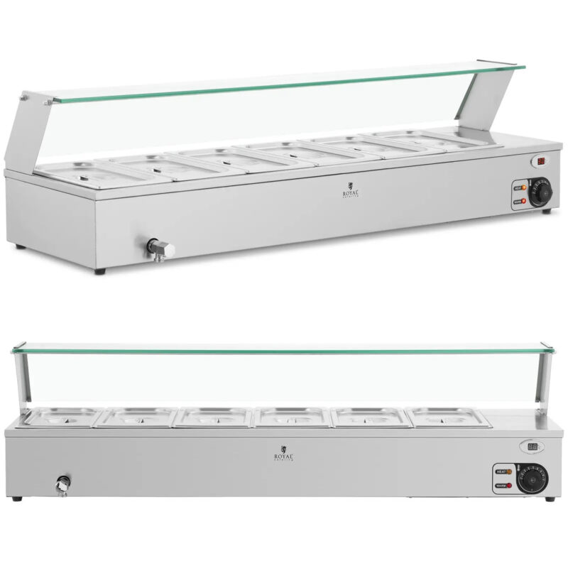 Bemar marki Royal Catering pozwala doskonale zaprezentować potrawy, które przez długi czas pozostają ciepłe. Sprawdzi się do użytku w restauracjach, hotelach, stołówkach, bufetach, barach z przekąskami, kawiarniach lub domach spokojnej starości i klinikach. 6 pojemników GN umożliwia przechowanie składników lub kilku różnych potraw, takie jak mięso, ryby, warzywa, ryż, ziemniaki i sos w żądanej temperaturze – bez ryzyka przypalenia. Duża moc 2100 W szybko podgrzewa kąpiel wodną do żądanej temperatury. Temperatura regulowana jest pokrętłem w zakresie 30-110°C. Bemar wyposażono w kurek spustowy ułatwiający użytkowanie. 6 pojemników GN 1/3 z pokrywkami oferuje łączną objętość 21 l. Pojemniki są całkowicie wyjmowane, można napełnić je żywnością bezpośrednio w strefie gotowania i umieścić w bemarze. Urządzenie posiada szklaną osłonę z bezpiecznego szkła. Montowana jest w kilku prostych krokach. Osłona chroni żywność i naczynia przed zabrudzeniami. Jednocześnie oferowane dania są dobrze widoczne dla klientów. Bemar wykonano ze stali nierdzewnej, która charakteryzuje się trwałością i odpornością na korozję oraz uderzenia. Jest neutralna dla zdrowia oraz łatwa w czyszczeniu, a zatem higieniczna.