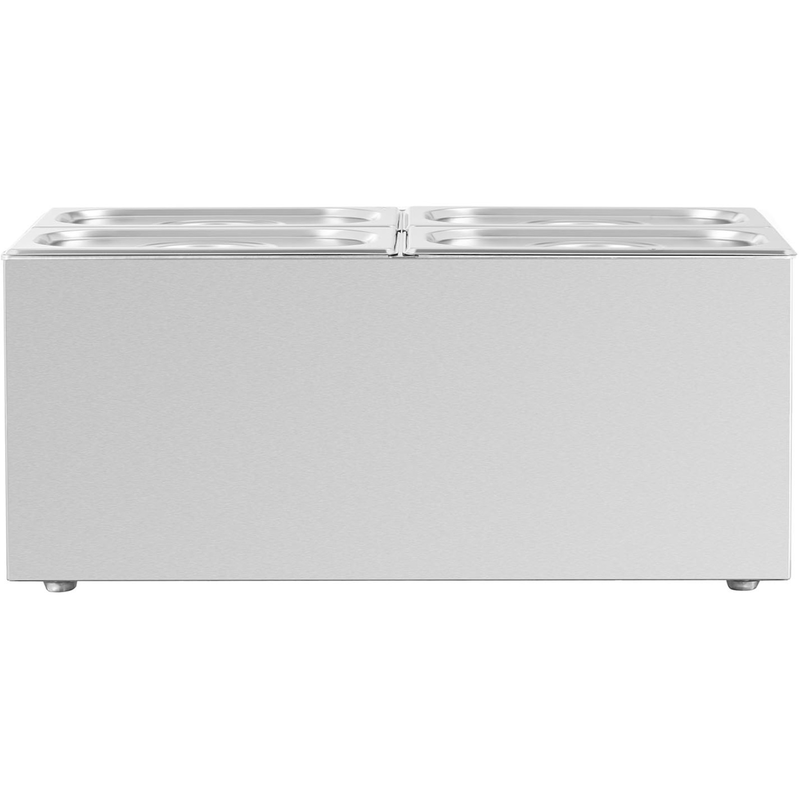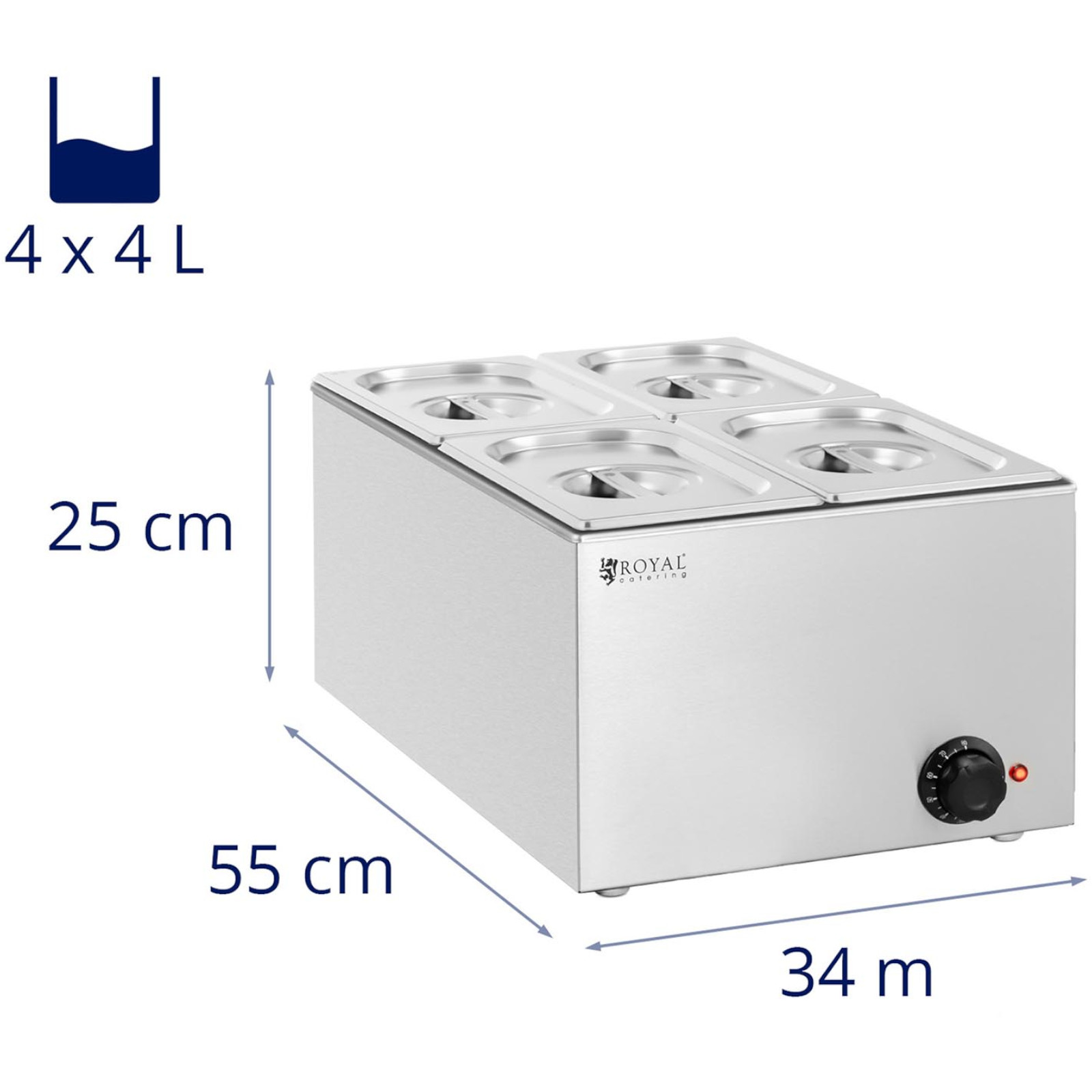 Bemar marki Royal Catering pozwala przechowywać potrawy w idealnej temperaturze przez długi czas. Przeznaczony został do 4 pojemników GN 1/4. Znajdzie zastosowanie w restauracjach, hotelach, stołówkach, bufetach, barach szybkiej obsługi, domach spokojnej starości czy w klinikach. Duża pojemność 16 l pozwala zmieścić dużą ilość potraw. Temperatura regulowana jest za pomocą pokrętła w zakresie 30-80°C. Element grzewczy o mocy 640 W podgrzewa wodę do wskazanej temperatury. Dzięki kąpieli wodnej potrawy nie przypalają się. Urządzenie wykonane zostało z wysokiej jakości stali nierdzewnej, jest odporne na korozję, łatwe w czyszczeniu i nieszkodliwe dla zdrowia. Gumowe nóżki zapewniają bemarowi stabilność.