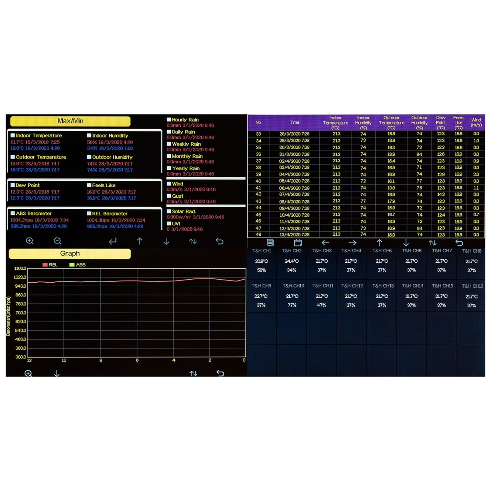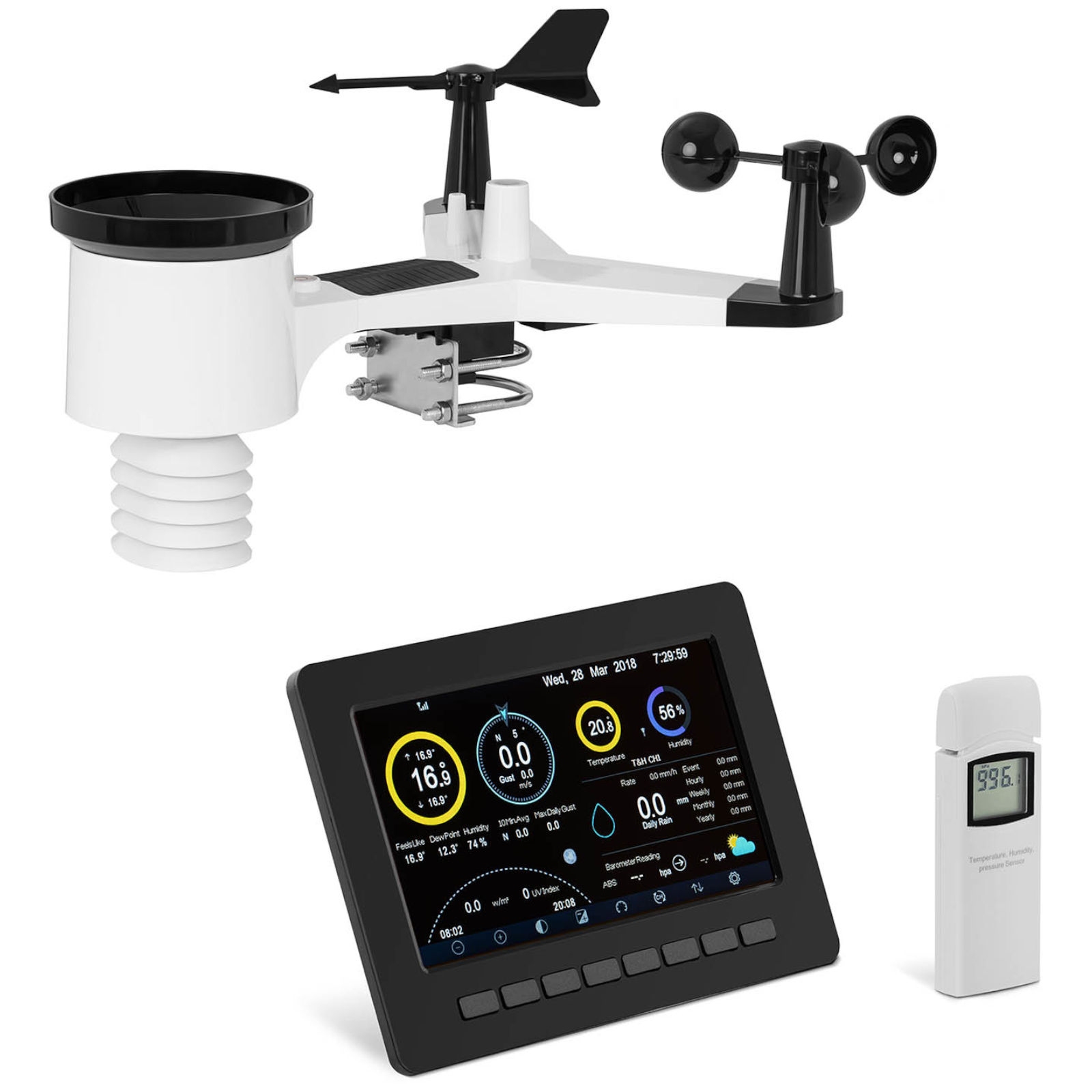 Czujnik zewnętrzny 7w1 dokonuje pomiaru prędkości i kierunku wiatru, temperatury, poziomu opadów, promieniowania słonecznego oraz UV. Dane przesyłane są za pomocą fal radiowych o częstotliwości 868 MHz z odległości 100 m. Wewnątrz pomieszczeń można sprawdzić dodatkowo temperaturę, wilgotność i ciśnienie atmosferyczne. Na podstawie zebranych danych urządzenie oblicza punkt rosy, temperaturę ochładzania wiatrem, indeks ciepła (HI), a także pokazuje fazę księżyca oraz czas zachodu / wschodu słońca. Informacje zapisywane są w historii. Jednostkę temperatury można zmieniać między °C / °F. Duży wyświetlacz LCD 7” zapewnia dużą widoczność, a prognoza pokazywana jest za pomocą symboli. Urządzenie wyposażono także w alarm. Panel słoneczny pozwala na uzyskanie dodatkowego źródła zasilania i rzadsze zmiany baterii. Stacja bazowa wyposażona została w zasilacz 5 V DC.