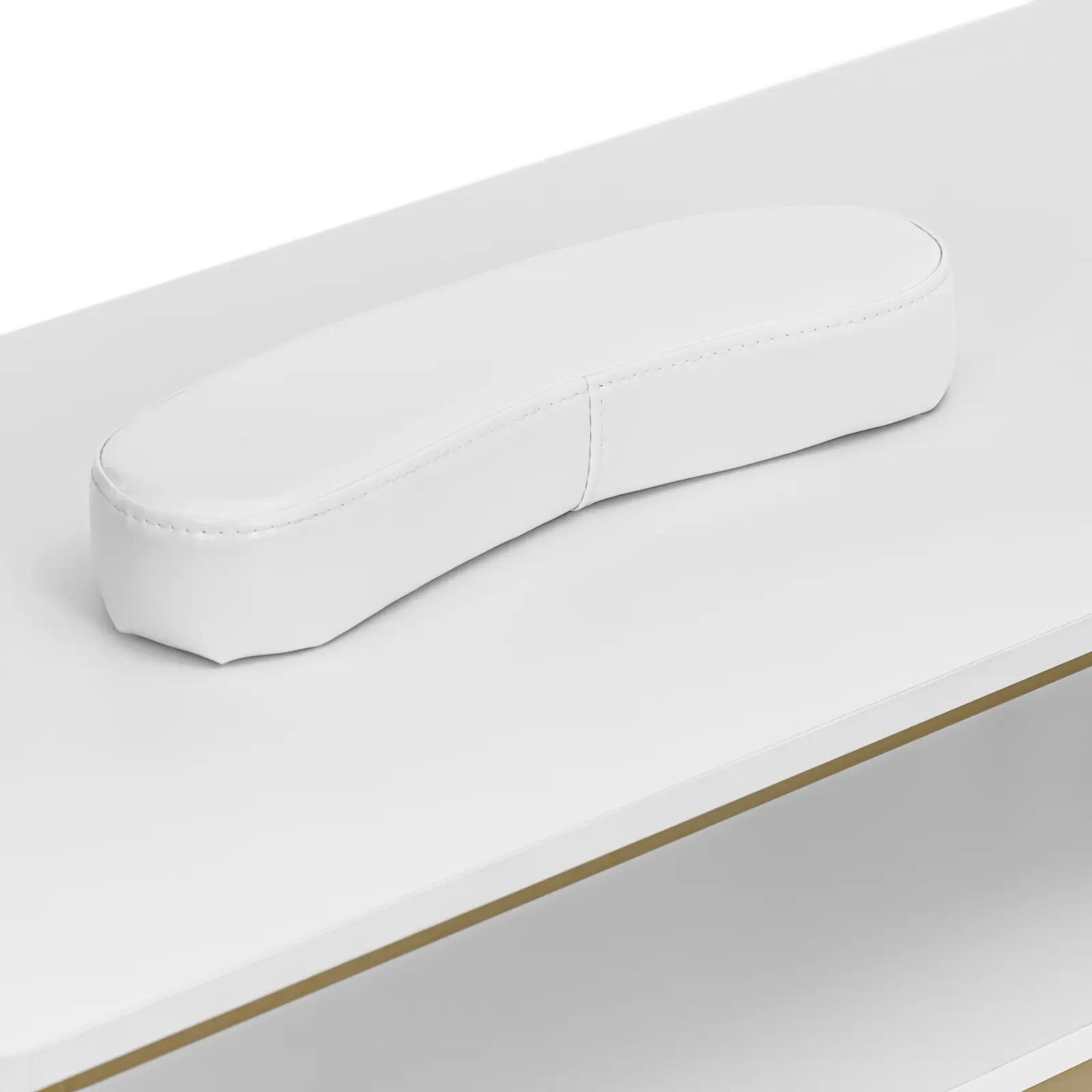 Biurko do manicure marki Physa zachwyca pod względem estetycznym jak i praktycznym. Ładna żelazna rama łączy blat, a także dodatkową przestrzeń pod spodem i szufladę, tworząc spójną całość, która uatrakcyjnia stanowisko pracy. Dołączona podpórka pod dłonie zapewnia najwyższy komfort podczas zabiegu. Subtelna biała kolorystyka ze złotą ramą z żelaza przyciąga wzrok. Obszerny blat zapewnia wystarczająco dużo miejsca do wygodnej pracy. Wszystkie przybory można schować w szufladzie i na dodatkowych półkach, zapewniając porządek i higienę. Gładkie powierzchnie i minimalistyczny design sprawiają, że mebel jest łatwy w czyszczeniu i higieniczny. Za sprawą wysokiej jakości wykonania i trwałych materiałów biurko sprosta wszystkim wyzwaniom codziennego użytkowania w studiu i zachwyci długą żywotnością i nieskazitelnym wyglądem.
