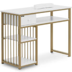 - – Biurko zachwyca stylowym designem w kolorze białym ze złotą ramą wykonaną z żelaza,