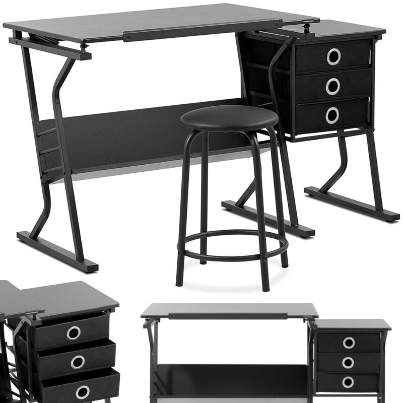 Biurko kreślarskie uchylne ze stolikiem szufladami i stołkiem 90 x 60 cm