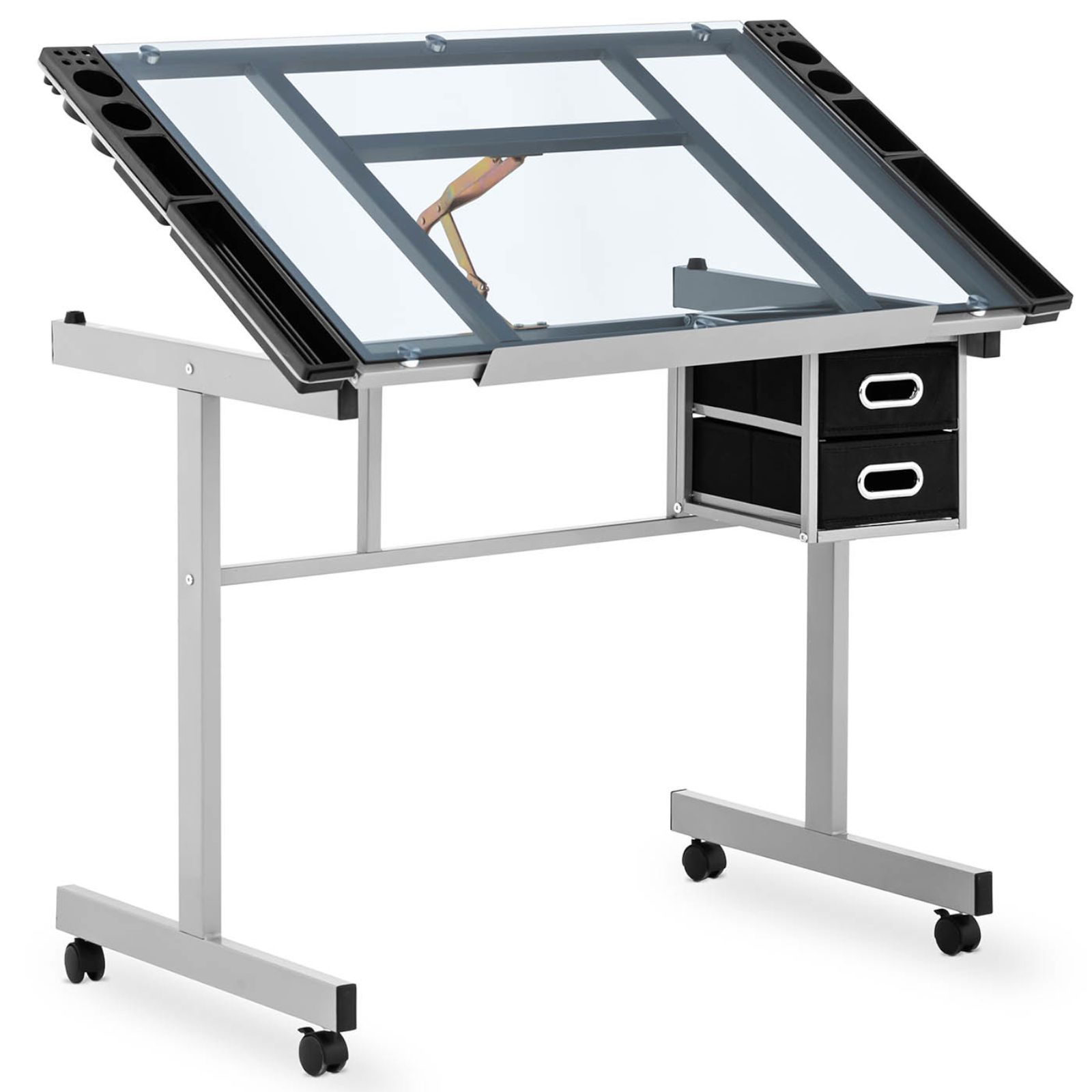 Biurko kreślarskie marki Fromm & Starck to niezastąpione elementy wyposażenia pracowni artystycznej lub biura architekta. Duża powierzchnia robocza o wymiarach 104 x 60 cm sprawia, że bezproblemowo rozłożysz całe arkusze papieru. Regulowana wysokość w zakresie 80-125 cm. Dodatkowo blat możesz ustawić pod kątem w zakresie 0-62°. Biurko kreślarskie posiada dwie pojemne szuflady oraz przyborniki. Blat o grubości 6 mm wykonano z hartowanego szkła. Do stworzenia ramy użyto stalowych rurek pomalowanych proszkowo. Biurko wyposażone w kółka i dwa hamulce.