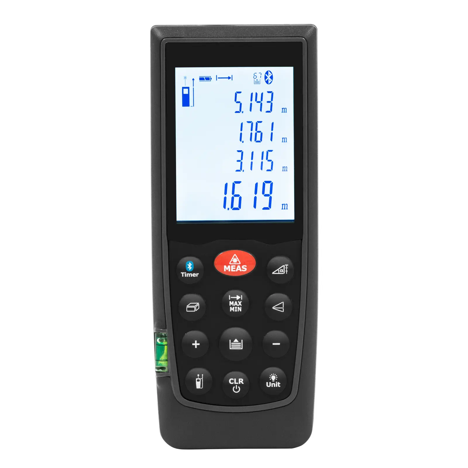 - – Laserowy przyrząd do pomiaru odległości, kątów, powierzchni i objętości posiada podświetlany wyświetlacz LCD,