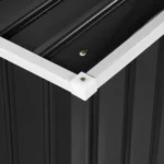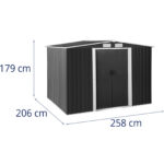 W metalowym domku narzędziowym marki Uniprodo można bezpiecznie przechować sprzęt ogrodniczy, zabawki i narzędzia. Z wymiarami 206 x 179 x 258 cm szopa ogrodowa na narzędzia zapewnia wystarczająco dużo miejsca do przechowywania mebli czy rowerów. Drzwi o wymiarach 96 x 154 cm umożliwiają wygodny dostęp i można je szybko i bezpiecznie zamknąć na kłódkę. Odporna na warunki atmosferyczne szafka ogrodowa ma dwuspadowy dach, którego szczyt jest wzmocniony i zapewnia optymalne wykorzystanie przestrzeni. W przypadku deszczu taki dach zapewnia doskonałe odprowadzanie wody. Domek ogrodowy na narzędzia nie ma spodu, dzięki czemu wilgoć przenika bezpośrednio do gruntu. Otwory wentylacyjne gwarantują optymalną cyrkulację powietrza i zapobiegają gromadzeniu się wilgoci, a nawet pleśni. Czyszczenie i konserwacja są ograniczone do minimum. Dodatkowo montaż szopy ogrodowej jest nieskomplikowany i poradzą sobie z nim nawet laicy. Metalowy domek narzędziowy imponuje długą żywotnością. Wykonany jest z ocynkowanej stali. Jest ona szczególnie odporna na korozję, a jednocześnie wyróżnia się niskimi kosztami utrzymania i dobrą możliwością recyklingu po zakończeniu użytkowania.