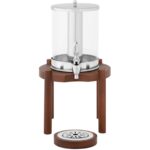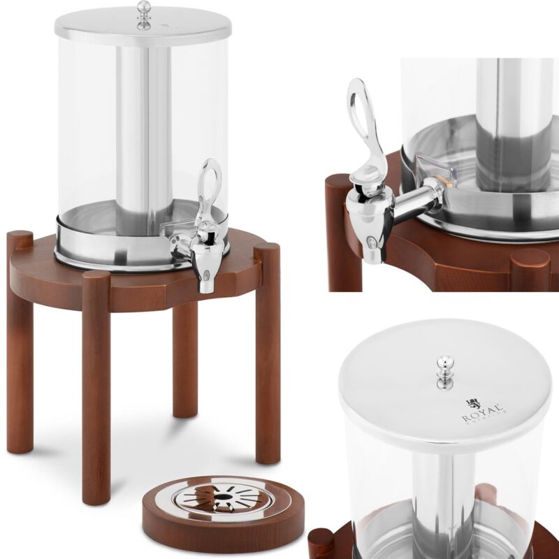 Duża pojemność wynosi 7l. Zawartość chłodzona jest poprzez lód umieszczony w rurce ze stali nierdzewnej. Ścianka zbiornika jest przezroczysta, co ułatwia kontrolowanie ilości płynów. Kranik szybko i precyzyjnie odmierza porcję napoju. Dyspenser wykonany został ze stali nierdzewnej, drewna oraz tworzywa PC. Dobrze wyważona podstawa zapewnia mu stabilność.