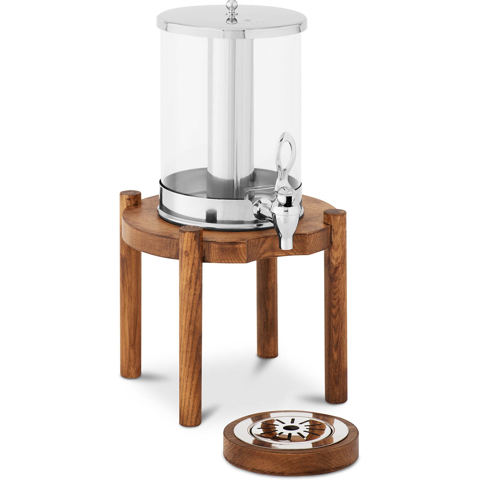 Duża pojemność wynosi 7l. Zawartość chłodzona jest poprzez lód umieszczony w rurce ze stali nierdzewnej. Ścianka zbiornika jest przezroczysta, co ułatwia kontrolowanie ilości płynów. Kranik szybko i precyzyjnie odmierza porcję napoju. Dyspenser wykonany został ze stali nierdzewnej, drewna oraz tworzywa PC. Dobrze wyważona podstawa zapewnia mu stabilność.