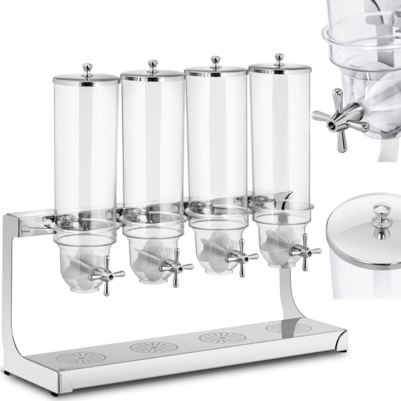 Dyspenser dozownik do płatków marki Royal Catering sprawdzi się w branży HoReCa, w restauracjach, hotelach czy bistrach oraz wszędzie tam, gdzie podawane są śniadania w formie bufetu. Umożliwia przechowywanie i dozowanie sypkich produktów zbożowych. płatków śniadaniowych, niewielkich herbatników, ciasteczek, cukierków, orzechów, suszonych owoców, kawy, ryżu itp.