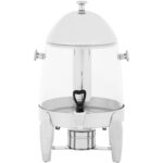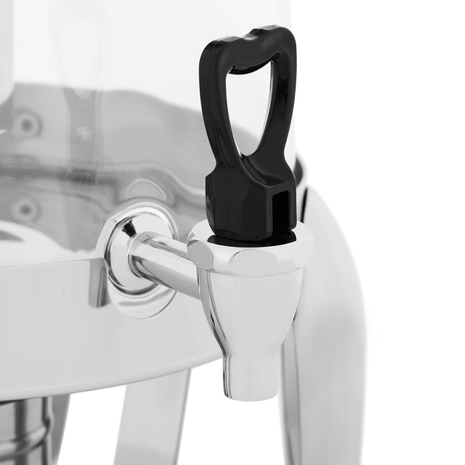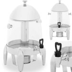 Dozownik marki Royal Catering sprawdzi się w hotelowych bufetach, czy na przyjęciach z cateringiem do serwowania napojów. Pojemność dozownika wynosi 12 l. Wykonany został ze stali nierdzewnej oraz przezroczystego tworzywa sztucznego, co zapewnia mu atrakcyjny wygląd. Posiada zarówno wkład chłodzący jak i zasobnik na paliwo, co umożliwia dozowanie chłodnych jak i ciepłych napojów. Cylindryczny pojemnik ma średnicę 273 mm. Nieprzepuszczalną wkładkę chłodzącą można wypełnić lodem, co równomiernie ochłodzi napój bez rozcieńczania. Wkład na pastę pozwala utrzymać w cieple gorące napoje, takie jak kawa czy herbata. Płynnie działający kran pozwala precyzyjnie odmierzać porcje napoju. Maksymalna wysokość naczyń pod kranem wynosi 132 mm.