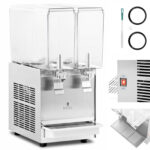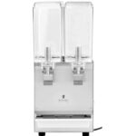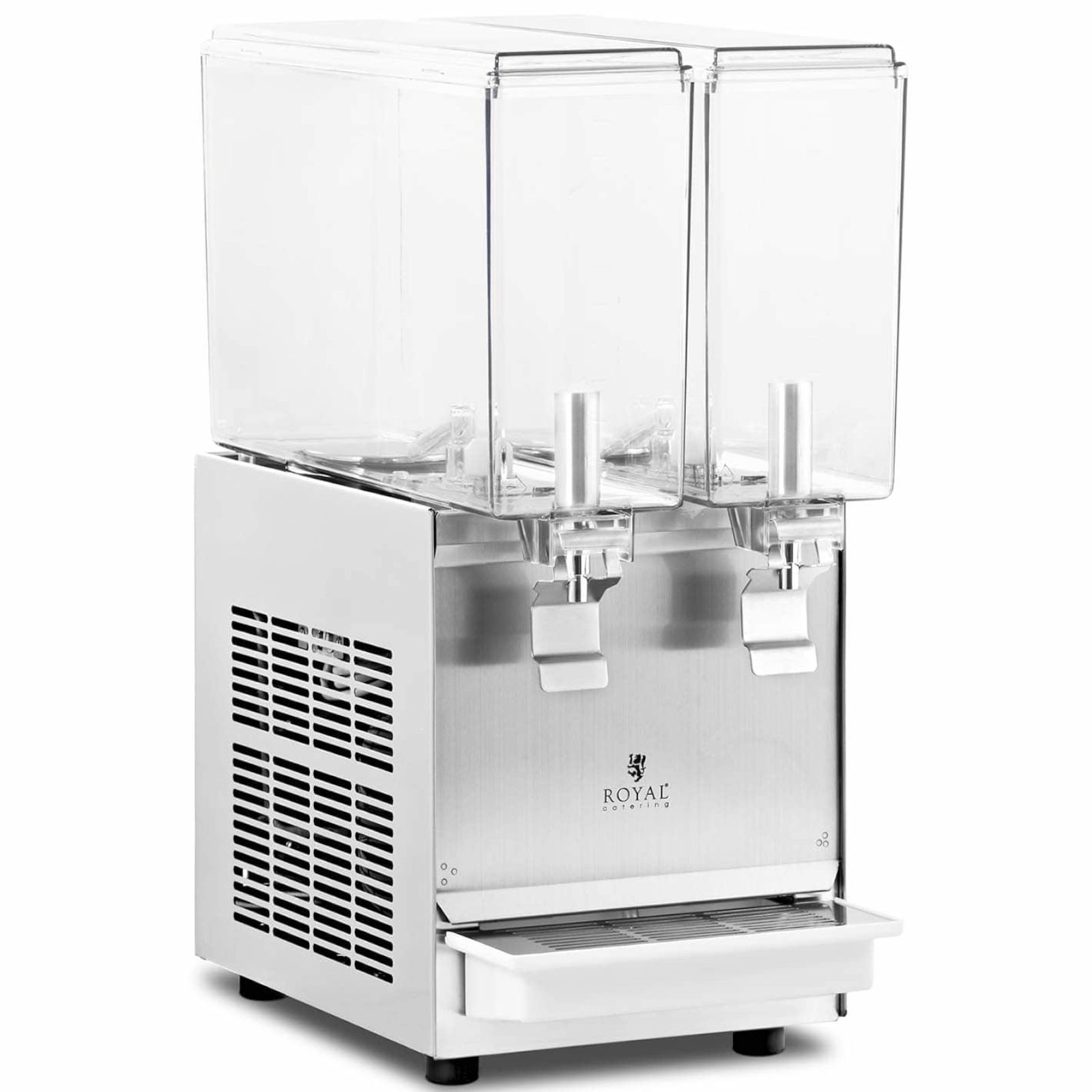 Dyspenser do napojów marki Royal Catering nadaje się do użytku w snack barach, kawiarniach, stoiskach na plaży lub festiwalach i innych imprezach lub punktach oferujących zimne napoje (koktajle, soki, trunki alkoholowe). Urządzenie posiada dwa 10-litrowe, przeźroczyste zbiorniki, które atrakcyjnie eksponują ich zawartość. Nalewanie napojów jest niezwykle proste za sprawą niekapiących kranów, które dodatkowo pomagają w utrzymaniu czystości. Dyspenser zasilany jest niezawodnym energooszczędnym silnikiem o mocy 290 W, a dodatkowe otwory wentylacyjne zapobiegają przegrzaniu się maszyny. Pojemniki zostały wykonane z przeźroczystego poliwęglanu, który jest odporny na wahania temperatury oraz są wytrzymałe na czynniki mechaniczne. Lekkie i solidne pokrywy pojemników chronią zawartość przed zanieczyszczeniem, a wyjmowana tacka ociekowa wyłapuje nadmiar płynów. jest łatwa do umycia i zapewnia czystość w miejscu pracy.