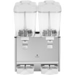 Dyspenser do schłodzonych napojów, dzięki dwóm pojemnym zbiornikom (2 x 18 l), jest przystosowany do podawania dwóch smaków jednocześnie. Dźwignie są bardzo poręczne, umożliwiają wygodne dozowanie soków. Zaledwie dwa przyciski do miksowania i chłodzenia zapewniają wygodną obsługę. Wirujące łopatki można także włączyć i wyłączyć. Wbudowana tacka ociekowa pozwala zachować czystość. Silnik o mocy 280 W zapewnia energooszczędność. Cykl roboczy dozownika wynosi 8-12 godzin. Zbiorniki wykonane zostały z poliwęglanu wolnego od BPA, są bezpieczne, odporne na wysokie i niskie temperatury oraz mechaniczne uszkodzenia. Pokrywy są lekkie i trwałe, zaprojektowano je by chronić zawartość przed czynnikami zewnętrznymi. Otwory wentylacyjne umożliwiają chłodzenie silnika a system rotacyjny z wirującymi łopatkami pozwala na dokładne mieszanie napojów. Gumowe nóżki pochłaniają wibracje i chronią powierzchnię.