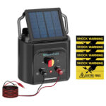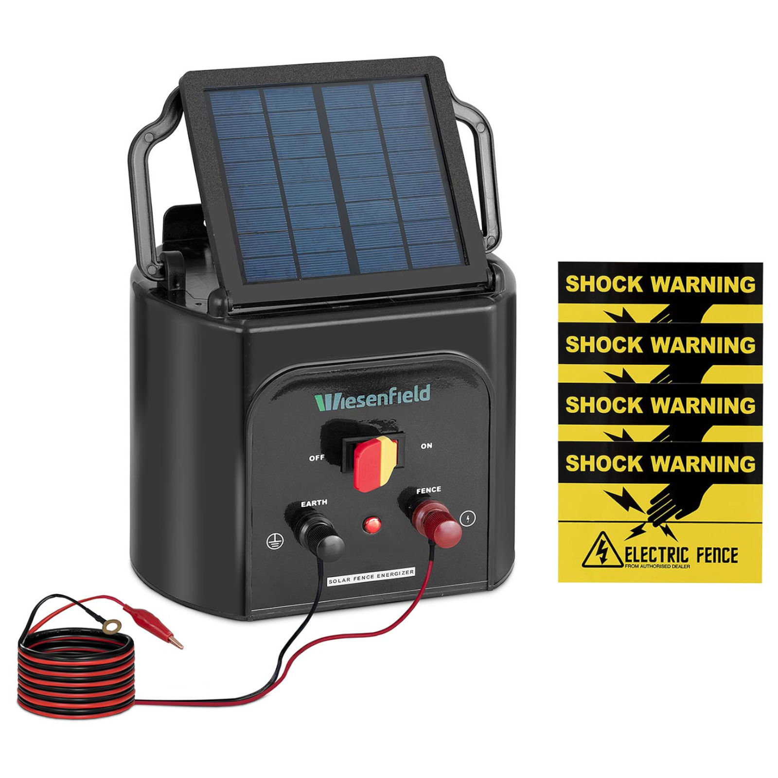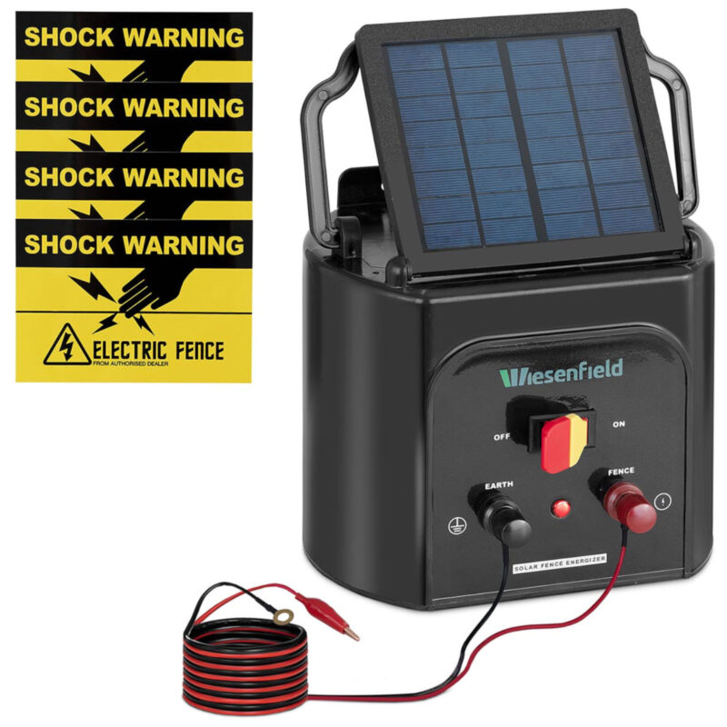 Elektryzator do ogrodzeń elektrycznych o dł. od 15 do 20 km marki Wiesenfield idealnie sprawdzi się do zabezpieczenia ogrodzeń pastwisk. Elektryzator ogrodzeniowy jest wyposażony w baterię 6 V, która niezawodnie zapewnia impuls w ogrodzeniu do 1.2 J. Dodatkowo na urządzeniu zainstalowano panel słoneczny o wymiarach 14 cm x 16 cm, który zasila całość w słoneczne dni. Oznacza to, że elektryzator może zasilać ogrodzenie pastwiska przez maksymalnie 21 dni bez przerwy, aż do ponownego pełnego naładowania baterii. Minimalizuje to czas potrzebny na kontrolę, a wypasane zwierzęta mogą bez obaw pozostać na łące. Elektryzator ogrodzeniowy jest wyposażony w przewody: uziemiający i połączeniowy. Elektryzator solarny jest przeznaczony dla zwierząt takich jak krowy, owce, osły, dziki czy świnie. Ogrodzenie chroni pasące się bydło oraz zapobiega przedostawaniu się dzikich zwierząt. Czas trwania impulsów wysokiego napięcia jest tak dobrany, aby zwierzęta cofały się po dotknięciu, ale nie mogły się zranić. Obudowa elektryzatora została wykonana z tworzywa sztucznego odpornego na promieniowanie UV. Bateria wyposażona jest w inteligentny system kontroli, który zapewnia bezpieczną pracę. Ochrona przed przeładowaniem i rozładowaniem stanowi dodatkowe zabezpieczenie. Do zestawu zostały dołączone cztery znaki ostrzegawcze.
