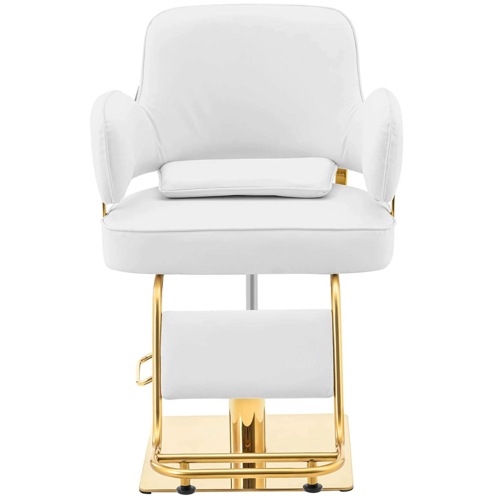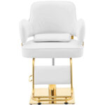 Fotel fryzjerski marki Physa sprawdzi się zarówno w salonie fryzjerskim, tatuażu, jak i kosmetycznym. Jego atrakcyjny wygląd w kolorze białym i złotym dodaje stylowego akcentu w salonie. Krzesło posiada elegancki złoty podnóżek. Fotel wyposażono w wygodne wysokie podłokietniki. Pianka, którą wypełniono mebel jest miękka i zachowuje swój kształt. Jest łatwa w czyszczeniu, odporna na kurz i wodę. Wysokość regulowana jest w zakresie 890 – 1020 mm za pomocą pompy hydraulicznej. Krzesło można obrócić o 360°. Stelaż fotela fryzjerskiego wykonany został z wytrzymałej i eleganckiej stali nierdzewnej. Konstrukcja wytrzymuje obciążenie do 200 kg, co przekłada się na wysoki poziom trwałości. Duża podstawa o średnicy 45 cm zapewnia mu dodatkową stabilność. Gładkie złote powierzchnie podkreślają stylowy wygląd.