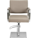 Fotel fryzjerski Otley marki Physa pozwoli stworzyć wygodną przestrzeń dla klientów i doda stylu salonowi. Subtelny design w beżowej kolorystyce z posrebrzanymi elementami ze stali nierdzewnej wpasuje się w każdy wystrój. Fotel fryzjerski z podnóżkiem i obitym oparciem zachwyci maksymalnym komfortem, czy to w salonie fryzjerskim, tatuażu, czy gabinecie kosmetycznym. Wysokość siedziska można wygodnie ustawić w zakresie od 50 do 66 cm za pomocą pompy hydraulicznej. Dodatkowo można obrócić krzesło do pozycji, która jest najwygodniejsza do pracy. W kilku prostych krokach można osiągnąć optymalną pozycję roboczą, która nie będzie męczyć, nawet podczas pracowitych dni. Klienci będą siedzieć niezwykle wygodnie na ergonomicznym krześle fryzjerskim. Dbają o to wysokie podłokietniki oraz wysokiej jakości pianka, która pełni funkcję wypełnienia. Jest miękka i zachowuje swój kształt. Wytrzymałe obicie ze sztucznej skóry jest łatwe w czyszczeniu, a ponadto nie wchłania kurzu i wody. Rama fotela fryzjerskiego wykonana jest z wytrzymałej i eleganckiej stali nierdzewnej. Solidna konstrukcja bezpiecznie znosi obciążenie 200 kg i zapewnia krzesłu wsparcie, a także wysoką trwałość. Duża podstawa o średnicy 45 cm zapewnia dodatkową stabilność. Gładkie powierzchnie z posrebrzanej stali nierdzewnej podkreślają stylowy wygląd.