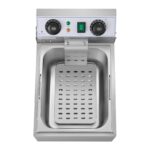 Elektryczna nastawna frytkownica Royal Catering, dzięki wydajnemu elementowi grzewczemu o mocy 3200W, jest w stanie w krótkim czasie usmażyć frytki, mięso, ryby, czy krążki cebulowe. Za utrzymanie temperatury na właściwym poziomie (50–200°C) odpowiada termostat regulowany wygodnym pokrętłem. Wbudowany timer umożliwia na ustawienie czasu pracy do 60 min. Lampki kontrolne pozwalają na szybkie sprawdzenie, czy olej już się nagrzał.
