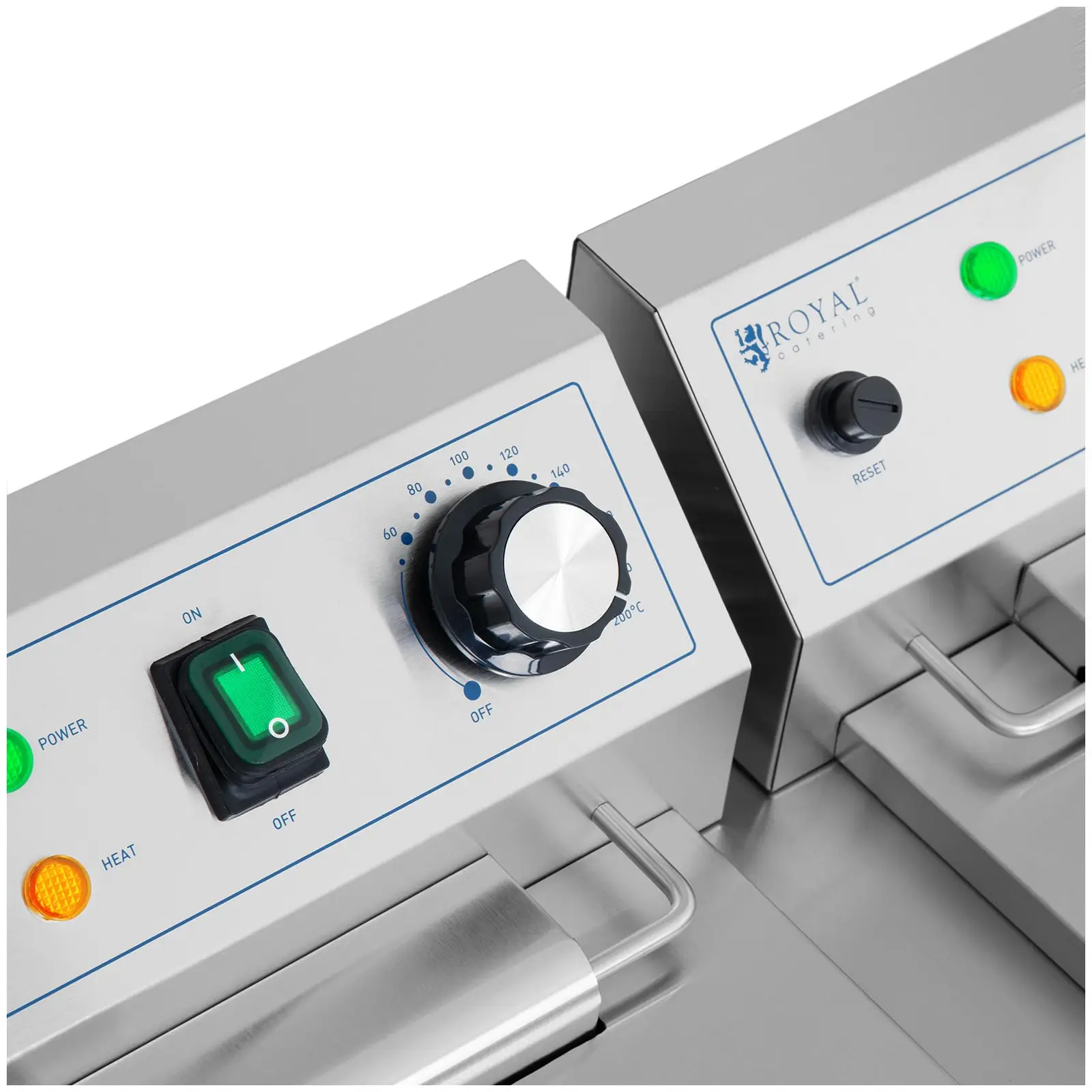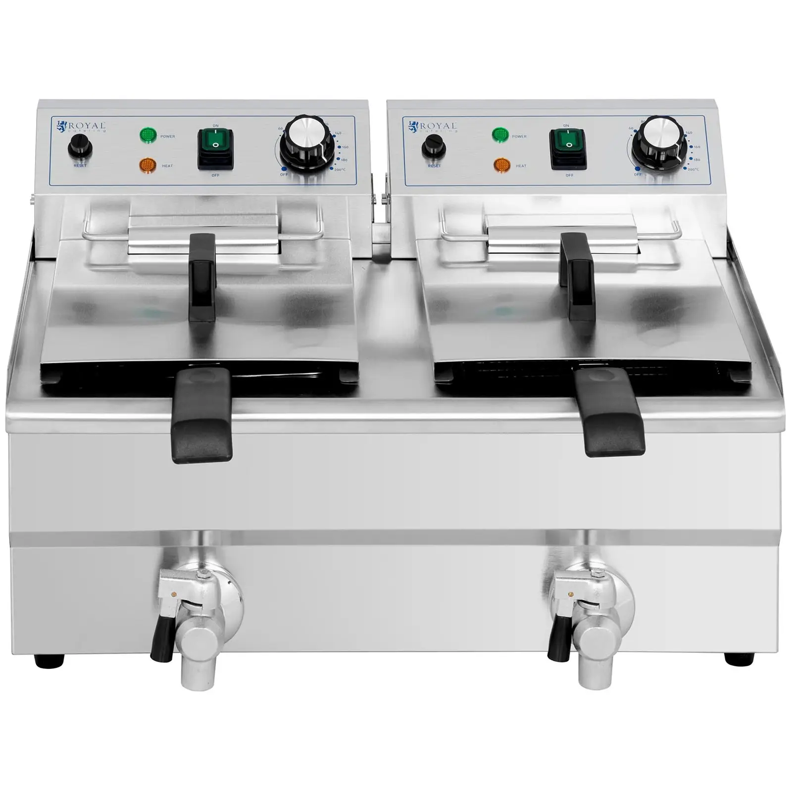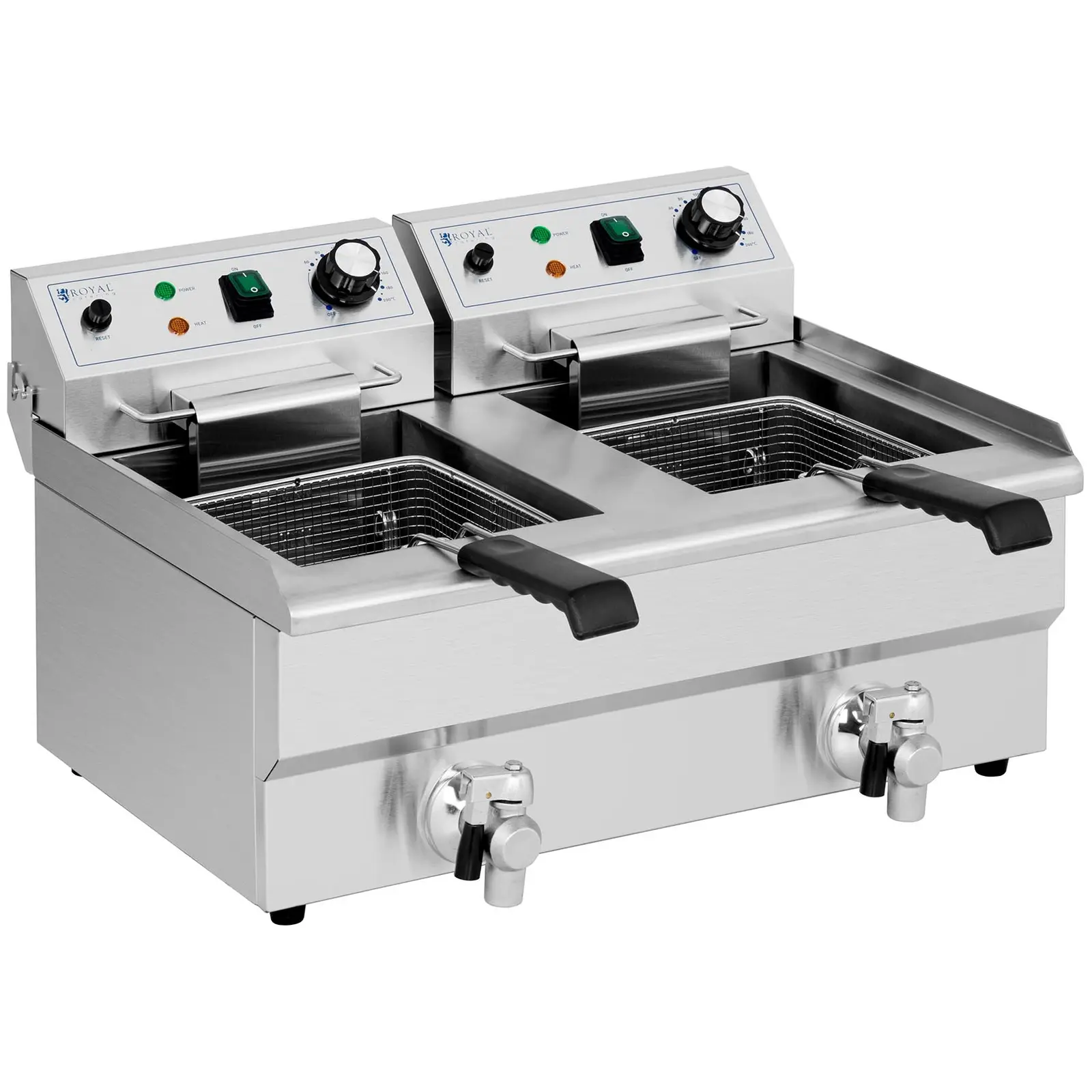 Frytownica gastronomiczna marki Royal Catering sprawdzi się w restauracji, hotelu czy na imprezach plenerowych do przyrządzania frytek a także ryb czy warzyw. Urządzenie posiada dwa 11-litrowe pojemniki. Do smażenia w głębokim tłuszczu można napełnić je nawet 9 litrami oleju. Umożliwia to jednoczesne przygotowanie dużych ilości przekąsek. Ponieważ oba pojemniki do frytowania mogą być używane niezależnie od siebie, nawet przygotowywanie różnych potraw w tym samym czasie stanie się proste. Wysoka moc 3000 W pozwala na szybkie nagrzewanie do maks. temperatury 200°C. Po osiągnięciu temperatury ok. 180°C można w krótkim czasie przygotować duże ilości frytek dzięki wydajności i objętości komór. Niezwykle czuły termostat utrzymuje stałą temperaturę smażenia. Kosze do smażenia we frytownicy mierzą 200 x 220 x 100 mm. Wyposażono je w termoizolacyjne uchwyty. Kosze o drobnych oczkach można zawiesić na krawędzi komór za pomocą wspornika, aby spłynął nadmiar oleju. Urządzenie wykonano ze stali nierdzewnej, która jest trwała i higieniczna oraz łatwa do czyszczenia. Dodatkowy plus przy czyszczeniu to wyjmowane elementy grzejne, dzięki czemu wszystkie powierzchnie są łatwo dostępne. Kurki spustowe umożliwiają szybkie usuniecie oleju. Pokrywa pozwala ochronić wnętrze przed zanieczyszczeniami. Antypoślizgowe gumowe nóżki zapewniają bezpieczne ustawienie w każdej kuchni.