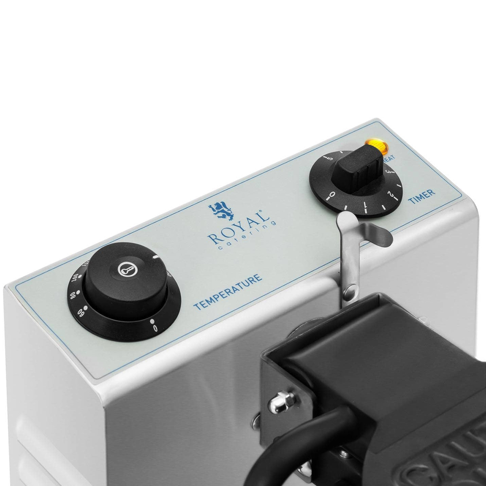 Gofrownica marki Royal Catering sprawdzi się w restauracji, kawiarni, barze czy na imprezach plenerowych do przygotowywania chrupiących gofrów. Urządzenie posiada regulację temperatury w zakresie 0-200°C. Timer ustawiany jest w przedziale 0-5 min. Duża moc pozwala na szybkie i efektywne przygotowanie gofra o dużej grubości 25 mm i średnicy 170 mm. Struktura urządzenia zapewnia typowy wzór belgijskich gofrów. Obudowa gofrownicy wykonana została z wysokiej jakości stali nierdzewnej. Posiada elegancki wygląd i jest łatwa w czyszczeniu. Dwie płyty do pieczenia wykonano z aluminium z powłoką teflonową. Płyty grzewcze w razie zużycia można wymienić. Pasujące płyty to Royal Catering 10012629.
