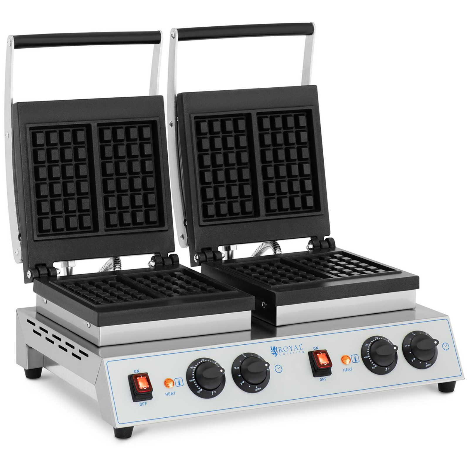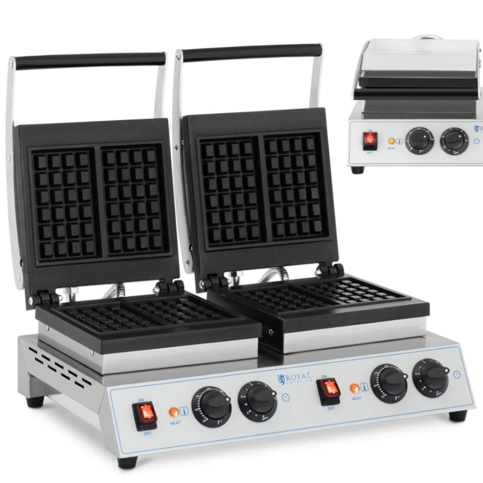 Gofrownica marki Royal Catering idealnie sprawdzi się w kawiarniach, restauracjach, na festynowych stoiskach czy w food truckach do wyrobu gofrów. Dzięki podwójnej konstrukcji pozwala przyrządzić jednocześnie 4 prostokątne gofry. Urządzenie posiada dużą wydajność – 2 x 1500 W, co zapewnia szybką gotowość do pracy. Temperatura regulowana jest w zakresie 50-300°C. Urządzenie posiada automatyczny termostat. Czas pieczenia wynosi 1-5 min (funkcja timer). Płyty grzewcze o wymiarach 170 x 100 mm wykonane zostały z żeliwa. Rynienki zapobiegają wyciekaniu ciasta. Obudowa wykonana została ze stali nierdzewnej. Za bezpieczeństwo odpowiadają termiczne rączki i antypoślizgowe nóżki.