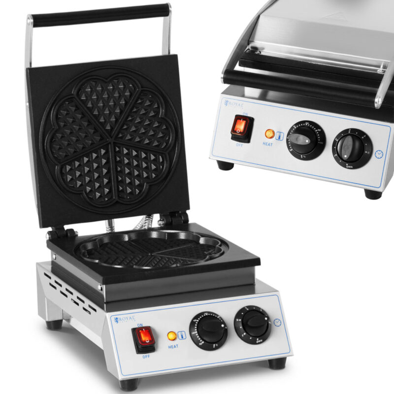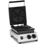 Gofrownica marki Royal Catering idealnie sprawdzi się w kawiarniach, restauracjach, na festynowych stoiskach czy w food truckach do wyrobu gofrów w kształcie serc. Urządzenie posiada dużą wydajność – 1500 W dzięki czemu jest bardzo szybko gotowe do pracy. Temperaturę można ustawić w zakresie 50-300°C. Urządzenie wyposażono w automatyczny termostat, czas pieczenia wynosi 0-5 min (funkcja timer). Płyty grzewcze o wymiarach 233 x 233 mm wykonane zostały z żeliwa pokrytego teflonem. Rynienka zapobiega wyciekaniu ciasta. Obudowa wykonana została ze stali nierdzewnej. Bezpieczeństwo zapewniają izolowana termicznie rączka oraz antypoślizgowe nóżki.