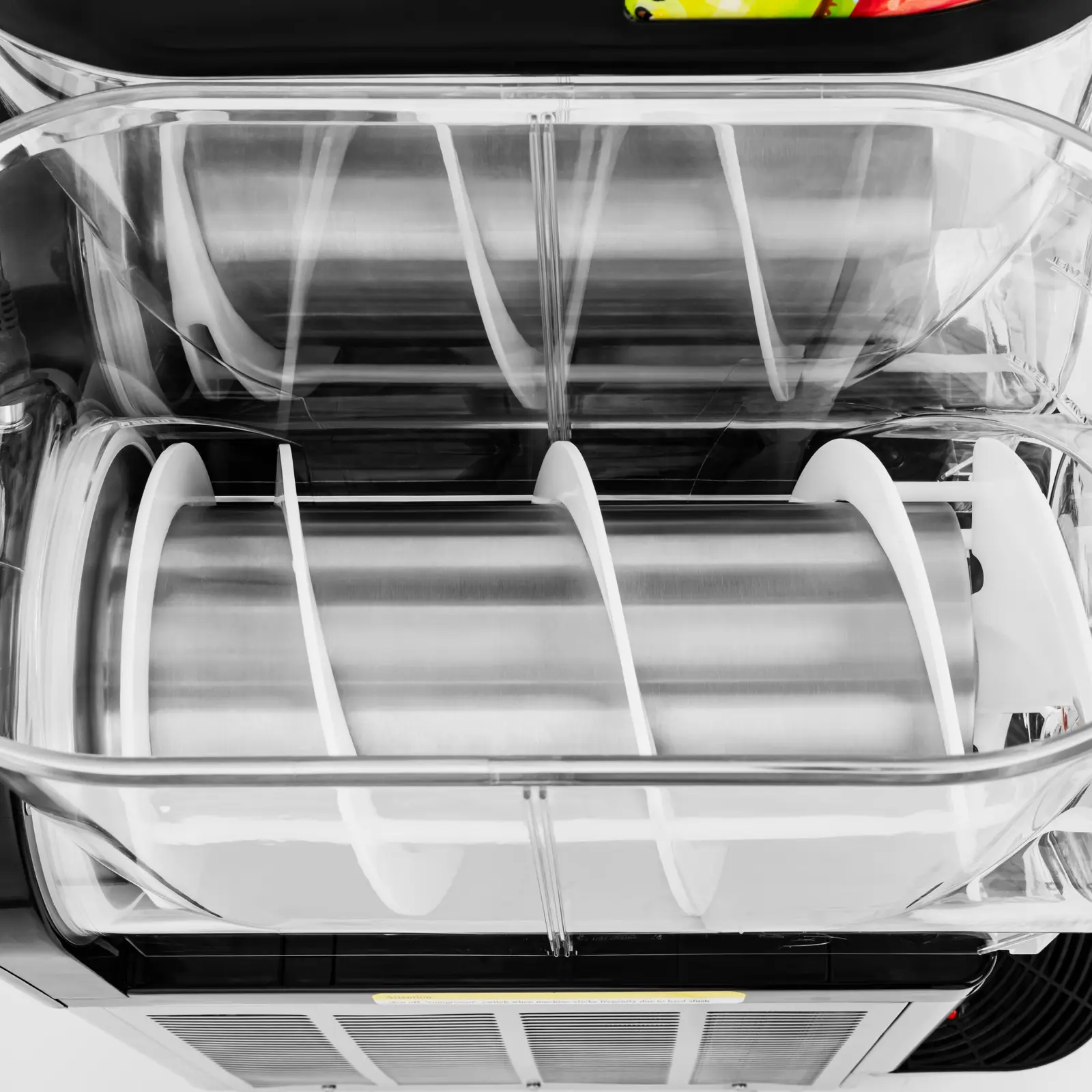 Granitor marki Royal Catering pozwala stworzyć w kawiarni lub barze kolorowe napoje bezalkoholowe, które atrakcyjnie prezentowane są z podświetleniem LED. Slushy to także orzeźwiająca atrakcja, która przyciąga wzrok na festynach, targowiskach czy na basenie. Maszyna pozwala również serwować wszelkiego rodzaju inne zimne napoje, takie jak napoje owocowe, koktajle, a nawet sorbety. Dzięki mocy 960 W i cyklowi pracy od 8 do 16 godzin maszyna zapewnia dużą ilość smacznego lodowego deseru. Energooszczędny czynnik chłodzący R290 dba o optymalną temperaturę w zakresie od -2 do 10°C, a mieszadło utrzymuje konsystencję bez grudek. Temperatura i funkcje ustawiane są na intuicyjnym, cyfrowym panelu sterowania z wyświetlaczem LED. Urządzenie posiada 3 pojemniki po 12 litrów każdy do produkcji granity, dzięki czemu można łączyć różne kolory i smaki w jednym urządzeniu. Aby zapewnić atrakcyjną prezentację, pojemniki są wykonane z przezroczystego tworzywa sztucznego niezawierającego BPA i podświetlane efektownymi diodami LED. Mieszadło utrzymuje mrożony napój w ruchu i w magiczny sposób przyciąga klientelę. Duże krany dozujące obsługuje się z łatwością. Tacki ociekowe utrzymają miejsce pracy w czystości. Pojemniki są zabezpieczone od góry pokrywą.