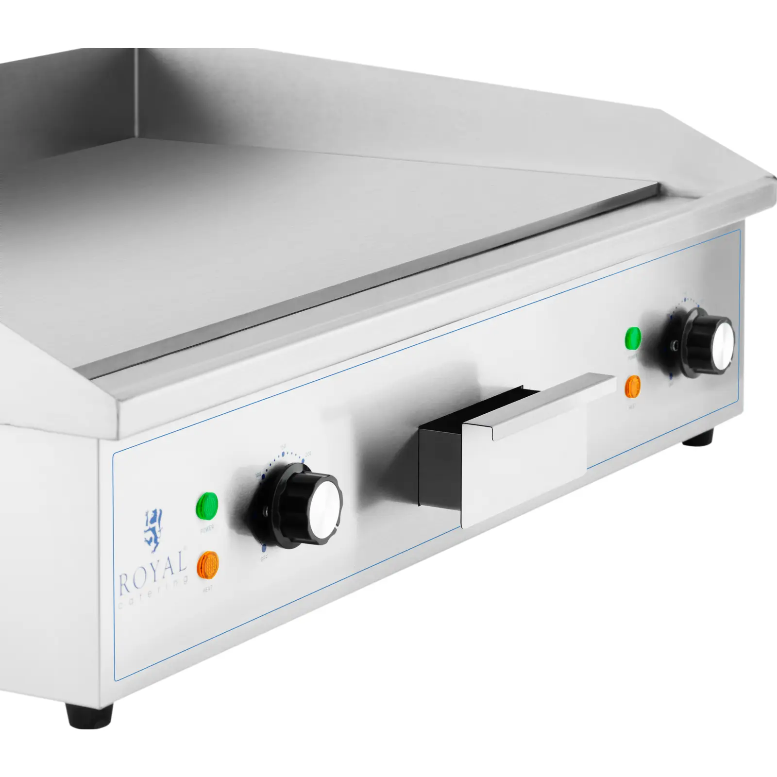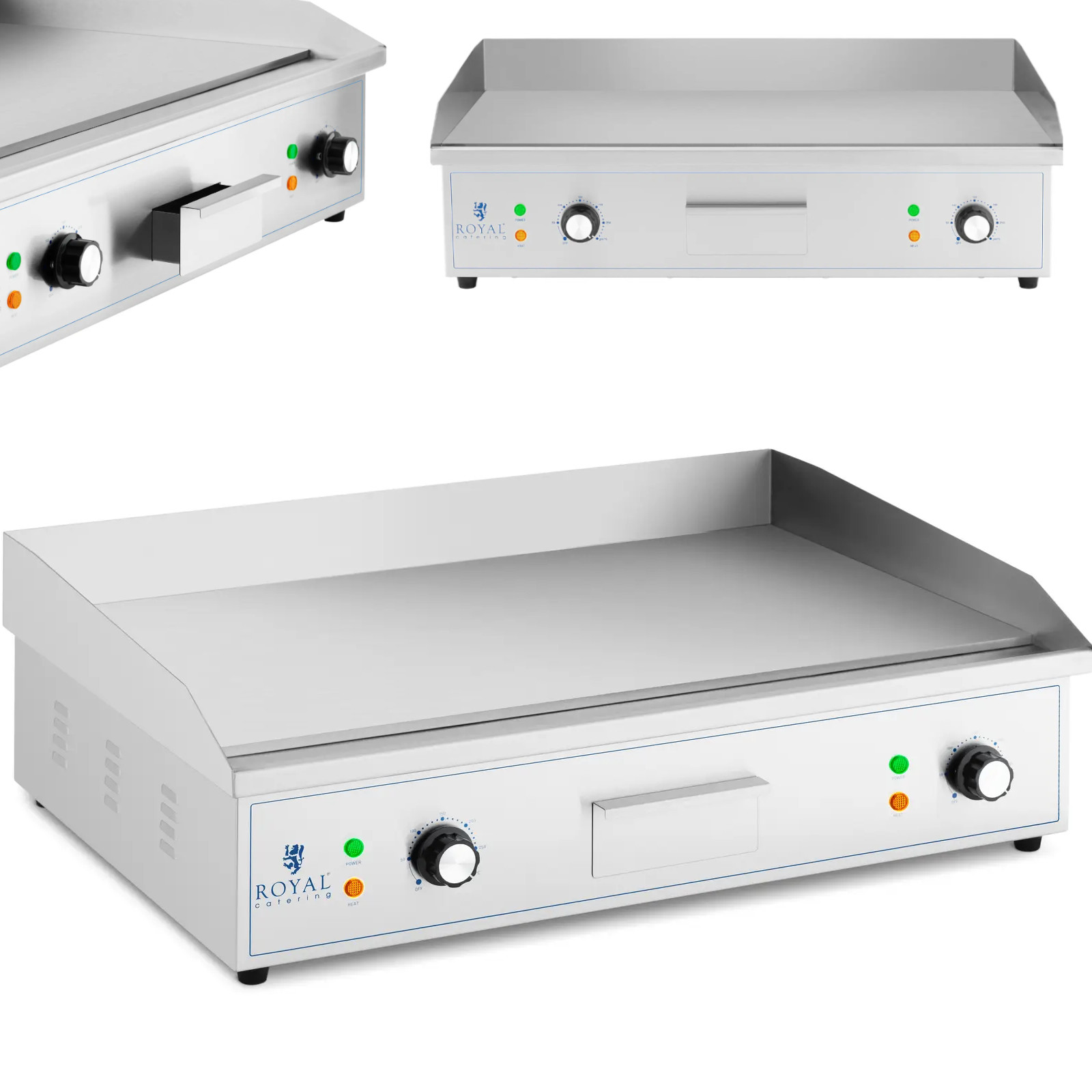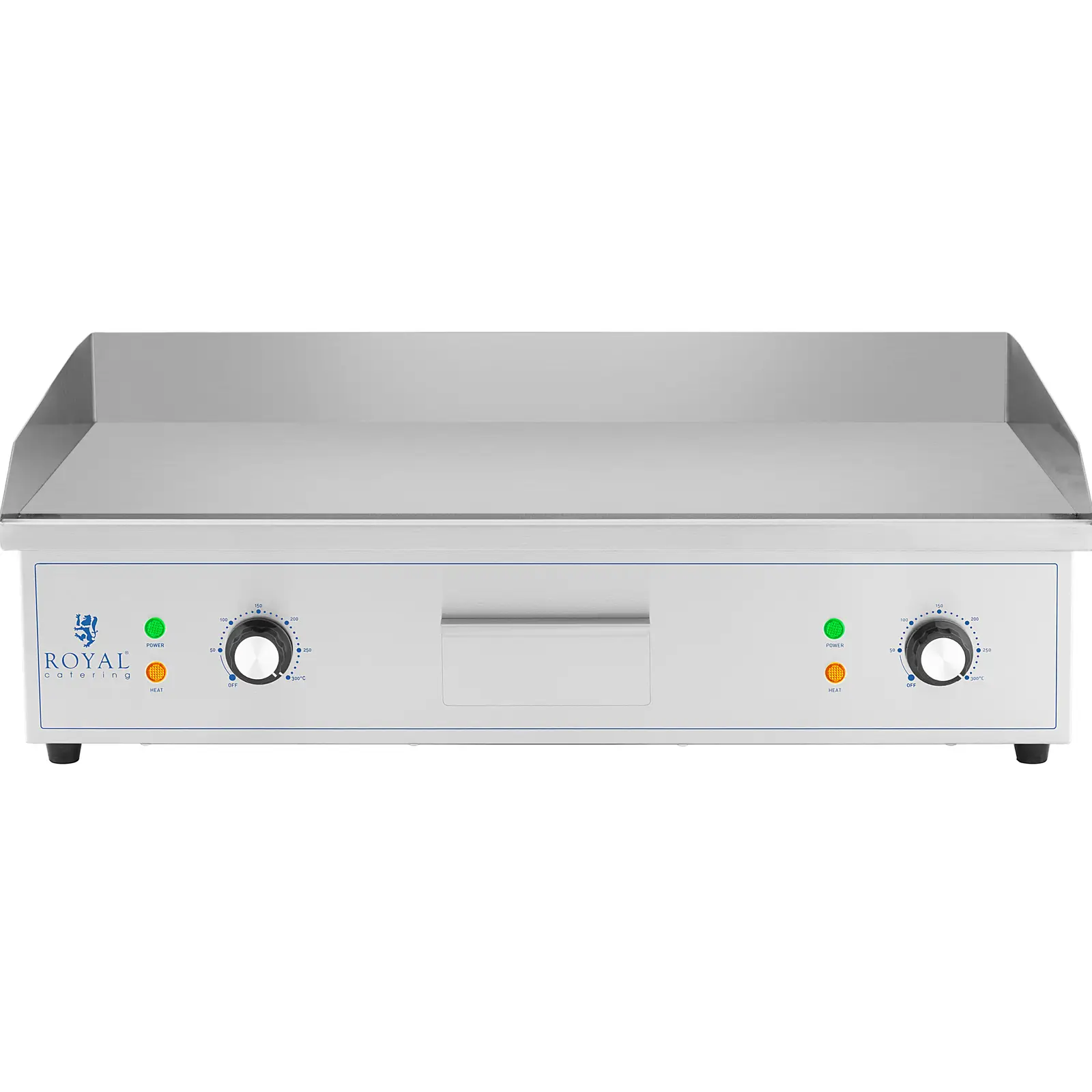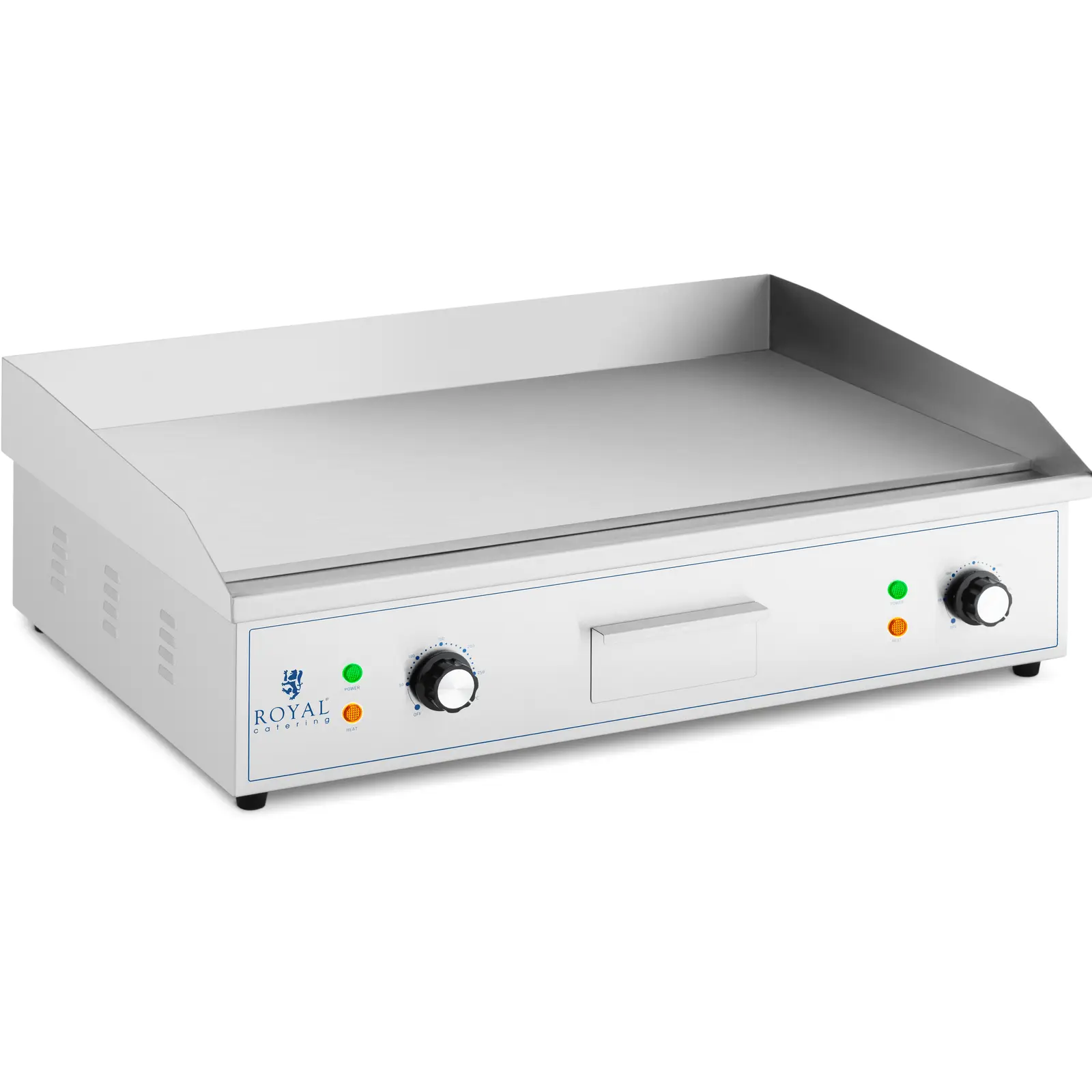 Płyta grillowa marki Royal Catering pozwala przyrządzić soczyste steki, hamburgery, ryby, omlety, tortille czy warzywa. Imponuje niskim wydzielaniem dymu oraz higienicznym i bardzo czystym sposobem pracy. Doskonale nadaje się do zastosowania w dużych kuchniach – od restauracji i barów z przekąskami po food trucki czy imprezy z cateringiem. W pełni automatyczny termostat zapewnia utrzymanie stałej temperatury. Wydajne elementy grzewcze o mocy 4400 W pozwalają szybko osiągnąć temperaturę roboczą w zakresie 50-300°C, którą można ustawić za pomocą poręcznych pokręteł. Płyta wykonana została z żeliwa. Szybko przenosi ciepło z elementu grzewczego na żywność, a jednocześnie długo zachowuje wysoką temperaturę. Płyta o grubości 10 mm ma wymiary 727 x 420 mm. Gładka powierzchnia pozwala usmażyć także jajka sadzone czy naleśniki. Grill wyposażono w osłonę przeciwbryzgową, która skutecznie chroni ściany i otoczenie przed rozpryskami tłuszczu. Obudowa gastronomicznej płyty grillowej jest wykonana z wysokiej jakości stali nierdzewnej i dlatego jest szczególnie odporna na korozję, neutralna w kontakcie z żywnością i wygodna w utrzymaniu. Łatwe czyszczenie zapewnia również skuteczne usuwanie tłuszczu. Grill elektryczny ma wyjmowaną szufladę połączoną z systemem drenażowym, do której spływa nadmiar tłuszczu ze smażenia. Tackę ociekową można łatwo wysunąć i wyczyścić. Stabilność urządzenia gwarantują antypoślizgowe nóżki, które nie rysują powierzchni roboczej.