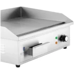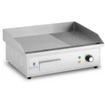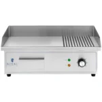 Profesjonalna płyta grillowa marki Royal Catering to sprzęt idealny dla branży HoReCa. Sprawdzi się w restauracjach, bufetach, barach szybkiej obsługi, hotelowych restauracjach i na przyjęciach z cateringiem. Nadaje się do smażenia jajek, kiełbasek, naleśników, bekonu, opiekania tostów itp. Gładka i ryflowana powierzchnia grillowa o wymiarach 548 x 350 mm umożliwia jednoczesne smażenie wielu porcji, np. steków lub burgerów. Obudowa ze stali nierdzewnej sprawia, że sprzęt jest odporny na wysoką temperaturę, łatwy w czyszczeniu i estetyczny. Powierzchnię grzewczą o grubości 10 mm wykonano z żelaza. Rant chroni przed pryskającym tłuszczem. Moc płyty grillowej wynosi 3000 W dzięki czemu urządzenie szybko się nagrzewa. Umożliwia to dopasowanie temperatury do różnych potraw w zakresie 50-300°C. O działaniu sprzętu informują lampki kontrolne. Wygodną obsługę zapewniają wyjmowana tacka na wytopiony tłuszcz oraz antypoślizgowe nóżki. Płyta umożliwia przygotowanie zdrowszych dań o niższej zawartości tłuszczu.