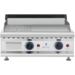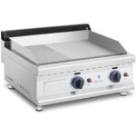 Gładka płyta grzewcza idealna do przyrządzania soczystych steków, kotletów, naleśników, bekonu czy jajek. Duża powierzchnia pozwoli na przygotować kilka dań jednocześnie. Powierzchnia gładka służy do smażenia a ryflowana do odsączania potraw z tłuszczu czy soków. Zakres grzania wynosi 50-300°C. Grill zasilany gazem, idealny w plener czy na camping. Urządzenie wykonano ze stali nierdzewnej, wytrzymalej i łatwej w utrzymaniu czystości.