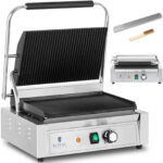 Grill kontaktowy marki Royal Catering sprawdzi się w restauracjach, fast foodach, barach, stołówkach a także w użytku domowym. Pozwala przyrządzić kotlety, burgery, kanapki. panini czy tortille a także grillowane warzywa. Dwie płyty grillowe wykonane zostały z żeliwa. Materiał ten doskonale przewodzi ciepło. Ryflowana powierzchnia zostawia charakterystyczny ślad na potrawie. Zamykana konstrukcja urządzenia pozwala na jednoczesne smażenie zarówno z góry jak i z dołu. Temperatura regulowana jest w zakresie 50-300°C. Wbudowany termostat automatycznie utrzymuje poziom grzania na określonej wartości.