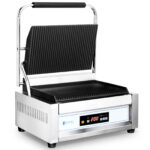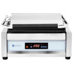 Grill kontaktowy marki Royal Catering idealnie sprawdzi się w profesjonalnych kuchniach, barach, food truckach, podczas kempingów czy imprez z cateringiem do grillowania burgerów, mięs, chleba, kanapek, warzyw, panini czy tortilli. Wszechstronność opiekacza to zasługa ryflowanej powierzchni, pozostawiającej na potrawach charakterystyczny wzorek. Duża moc 2200 W pozwala osiągnąć odpowiednią temperaturę w krótkim czasie. Wbudowany termostat regulowany w zakresie 50-300°C utrzymuje grzanie na stałym poziomie. Płyty wykonane zostały z żeliwa, które bardzo dobrze przewodzi wysoką temperaturę oraz utrzymuje ją przez długi czas. Zastosowanie dwóch płyt – dolnej o wymiarach 34 x 23 cm oraz górnej o wymiarach 33 x 21 cm pozwala na grillowanie potraw z dwóch stron jednocześnie. Elektroniczny panel sterowania zapewnia intuicyjną obsługę.