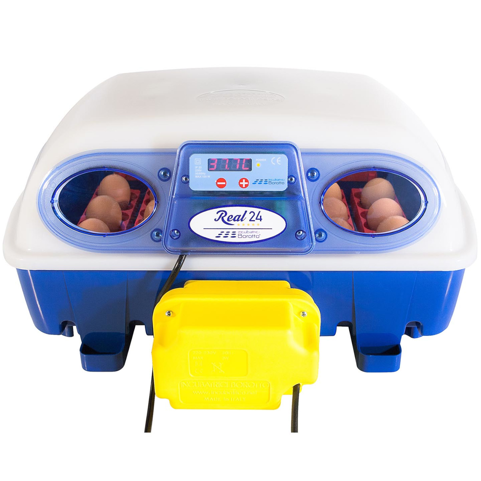 Inkubator do jaj marki Borotto nadaje się do wylęgu jaj kur, bażantów, perliczek, przepiórek, kuropatw, kaczek, gęsi, pawi, gołębi oraz różnych ptaków egzotycznych i drapieżnych. Automatyczny system obracania jaj działa przez cały proces inkubacji. Są one obracane od prawej do lewej strony lub odwrotnie w 1-godzinnych cyklach. Dwa okna umożliwiają wygodne sprawdzanie przebiegu wylęgu bez konieczności otwierania urządzenia. Tacka pomieści w pionie każdy rodzaj jaj od gęsich do przepiórczych. We wnętrzu można inkubować jednocześnie 24 jaja kurze lub 96 przepiórczych. Uzupełnianie wody jest możliwe dzięki zewnętrznym wlewom. Zastosowano również system statycznego nawadniania. Opiera się on na wykorzystaniu specjalnych rowków na dnie urządzenia, które zapewniają optymalny poziom nawilżenia. Wynosi on 45-55% z wodą na jednej tacce, a 60-65% na dwóch.
