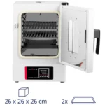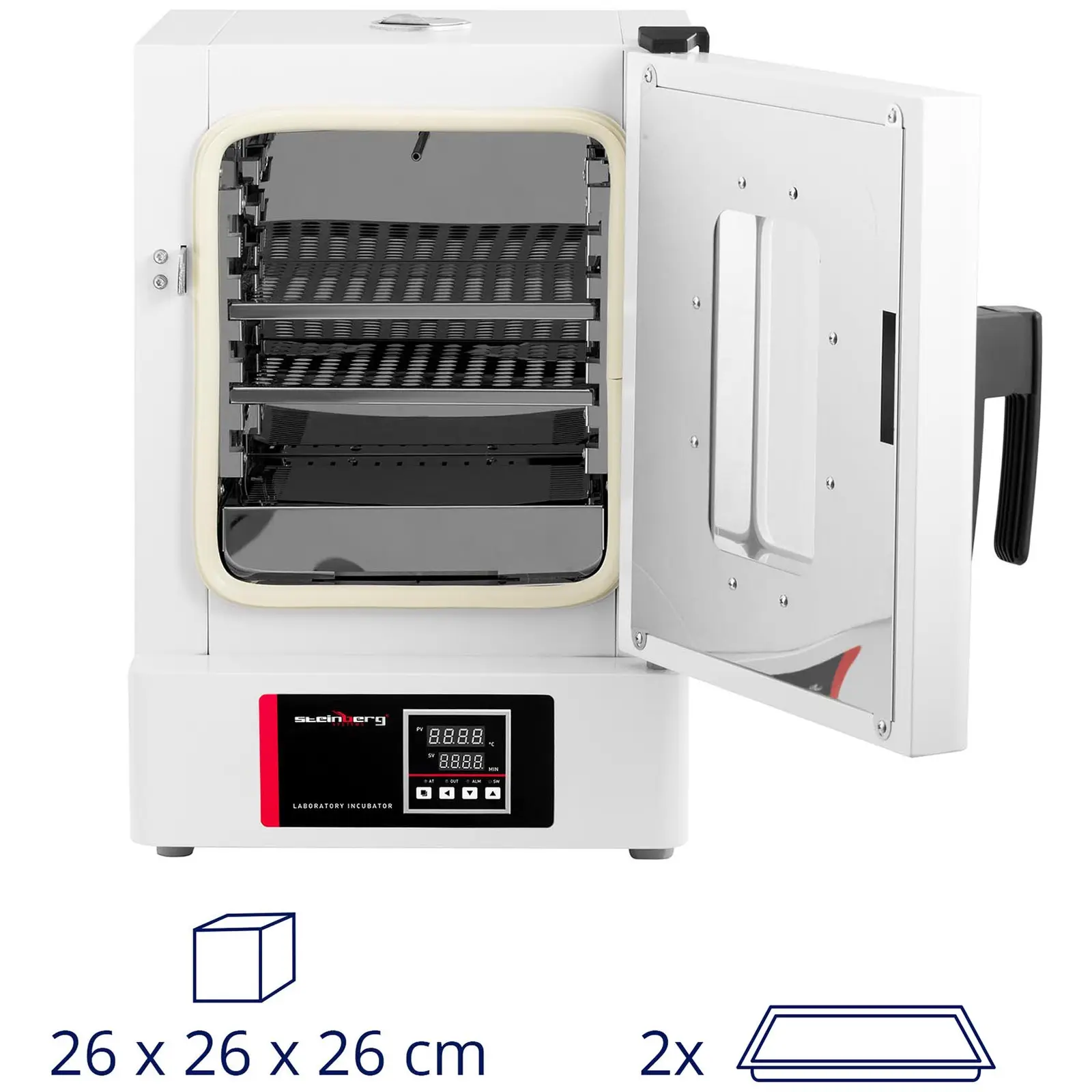 Inkubator laboratoryjny marki Steinberg Systems zapewni stałą temperaturę dla mikroorganizmów, kultur komórkowych i sadzonek. Dzięki optymalnej kontroli temperatury i solidnej obudowie jest niezawodną pomocą w każdym laboratorium w branżach farmacji, medycyny, analizy żywności czy innych badaniach. Można go łatwo i skutecznie stosować. Cieplarka laboratoryjna zapewnia optymalne warunki za pomocą sterowania PID. Można je ustawić na dotykowym panelu sterowniczym i sprawdzić na wyświetlaczu LED. Oferuje takie funkcje, jak ustawienie czasu i temperatury, zabezpieczenie przed przegrzaniem, timer i automatyczne wyłączanie. Regulator temperatury precyzyjnie utrzymuje ustawioną temperaturę w zakresie od 5 (temperatura otoczenia) do 70°C w ustawionym czasie od 0 do 9999 min. Najniższa temperatura nigdy nie spada poniżej temperatury pomieszczenia. Jest to stale sprawdzane przez czujniki i automatycznie korygowane w przypadku odchyleń. W rezultacie inkubator utrzymuje temperaturę z dokładnością do ± 2°C. Drzwi do przestronnego wnętrza są hermetycznie uszczelnione uszczelką z gumy silikonowej, co zapewnia minimalną utratę temperatury podczas inkubacji kultur lub bakterii. Okno ze szkła hartowanego jest również odporne na ciepło. Wnętrze wykonano ze stali nierdzewnej, dzięki czemu jest niezwykle łatwe w pielęgnacji i niewrażliwe na korozję lub inne wpływy otoczenia. Dzięki pojemności 18 l cieplarka jest kompaktowa i może być  używana w niedużych przestrzeniach. Dzięki poziomom o regulowanej wysokości wnętrze można wykorzystać oraz dostosować do różnych próbek lub kultur. Obudowa wykonana jest z wytrzymałej walcowanej stali, która została pokryta powłoką elektrostatyczną. Dzięki temu zewnętrzna warstwa charakteryzuje się niezwykłą trwałością. Oznacza to, że inkubator laboratoryjny wytrzymuje duże obciążenia i łatwo się czyści.