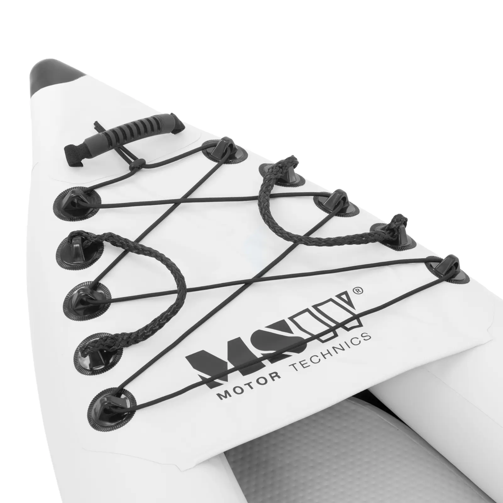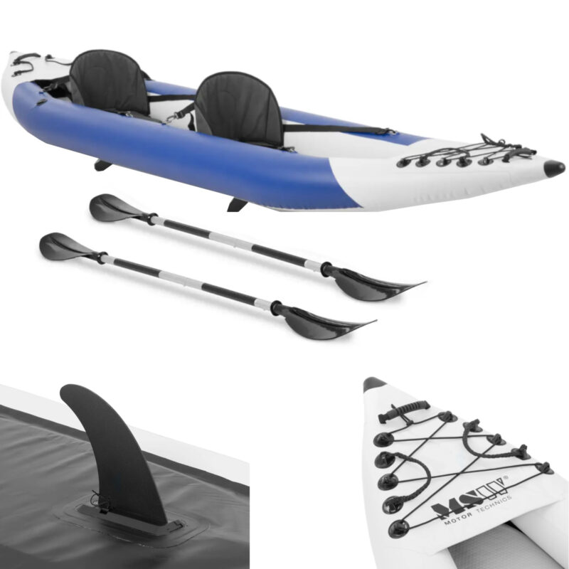 Kajak dmuchany marki MSW sprawdzi się do odkrywania spokojnych wód przybrzeżnych, zatok, małych jezior czy kanałów. Przeznaczony został dla dwóch osób, można go obciążyć do 180 kg. Kompletny zestaw zawiera wszystko, co potrzebne jest do odkrywania wody, dwa wiosła o długości 223 cm, dwie płetwy, dwa siedziska z oparciem, a nawet pompkę i zestaw naprawczy. Po użyciu całość można schować do dołączonej torby i łatwo przewieźć w bagażniku samochodu lub w autobusie czy pociągu. W ciągu kilku minut można napompować kajak za pomocą dołączonej pompki. Następnie wystarczy zamontować podstawę oraz siedziska. Dwa uchwyty na kadłubie pozwalają na łatwy transport nad wodę. Lekkie aluminiowe wiosła z plastikowym piórem pozwalają manewrować i obierać pożądany kierunek. Specjalna konstrukcja z czterema komorami powietrznymi (dwie na kadłubie, jedna na dolnym pokładzie i kil ze stępką w kształcie V) sprawia, że kajak bardzo dobrze i bezpiecznie leży na wodzie. Dlatego nadaje się również dla początkujących. Wykonany został z wysokiej jakości materiałów, takich jak stal nierdzewna, aluminium, plastik (polichlorek winylu i polipropylen) oraz nylon. Kajak jest szczególnie wytrzymały. Zapewnia to również odporna na promieniowanie UV, trójwarstwowa tkanina (PVC, nylon i ponownie PVC) korpusu. W zestawie znajduje się zestaw naprawczy – na wszelki wypadek.