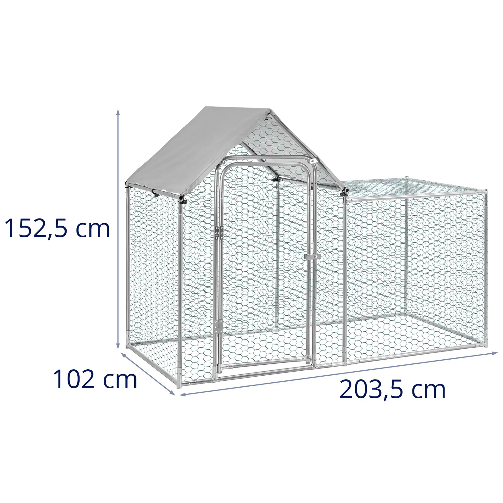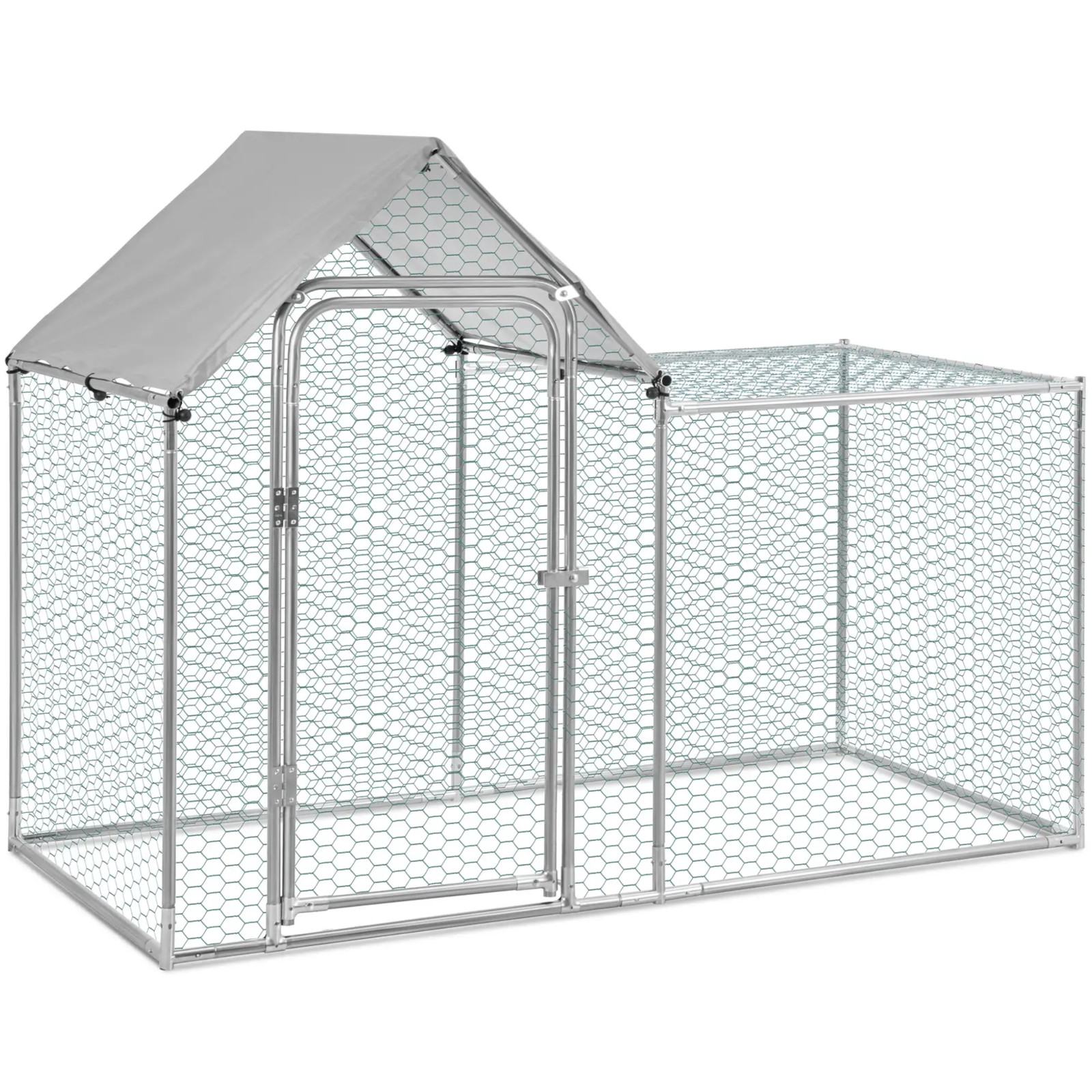 Kojec dla królików marki Wiesenfield oferuje bezpieczne miejsce, którego ściany są wykonane z niemal niewidocznej drucianej siatki. W niej króliki, zające, świnki morskie i inne małe zwierzęta trzymają się bezpiecznie razem i są chronione przed dzikimi zwierzętami, takimi jak lisy czy szopy. Za pomocą instrukcji montażu można szybko i bezpiecznie złożyć ramę i ściany. Kilka słupków ziemnych utrzyma konstrukcję pewnie w ziemi i zapewni niezbędną stabilność. Wszystkie materiały są odporne na warunki atmosferyczne i przeznaczone do użytku na zewnątrz. Stalowe słupy rusztowania są ocynkowane, a siatka druciana na ściany jest pokryta PVC. Plandeka PE służy również jako ochrona przed deszczem i w razie potrzeby można przymocować ją do dachu za pomocą gumek. Aby ułatwić wejście do wybiegu dla królików, został on wyposażony w duże drzwiczki, które można bezpiecznie zamknąć na zatrzask. Kojec dla królika jest wolnostojący. Wystarczy postawić go w ogrodzie w wybranym miejscu. Wnętrze jest wystarczająco duże, aby zmieścić zabawki dla królików lub jaskinie (brak w zestawie). W ten sposób można stworzyć urozmaicone miejsce na świeżym powietrzu dla zwierząt, w którym poczują się komfortowo.