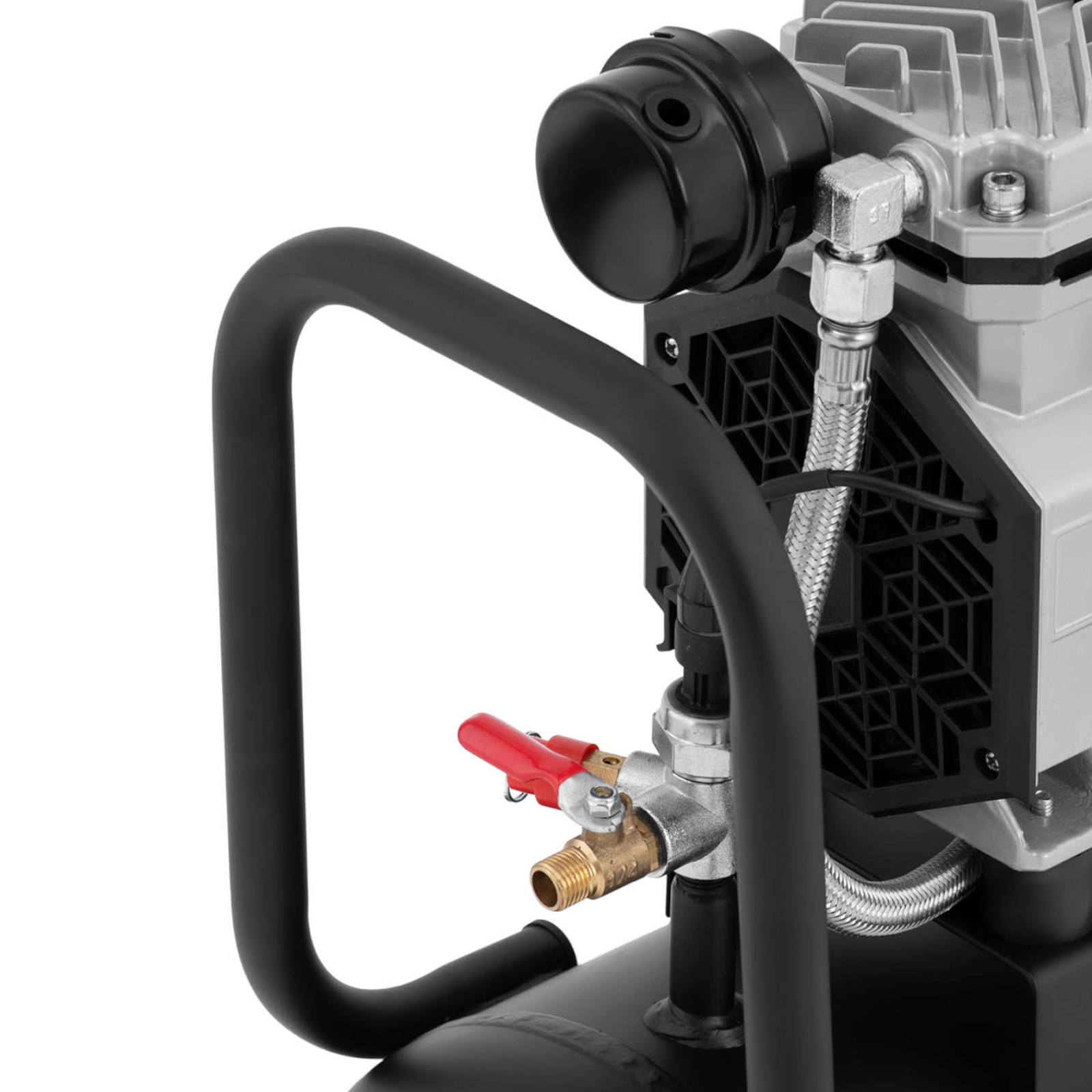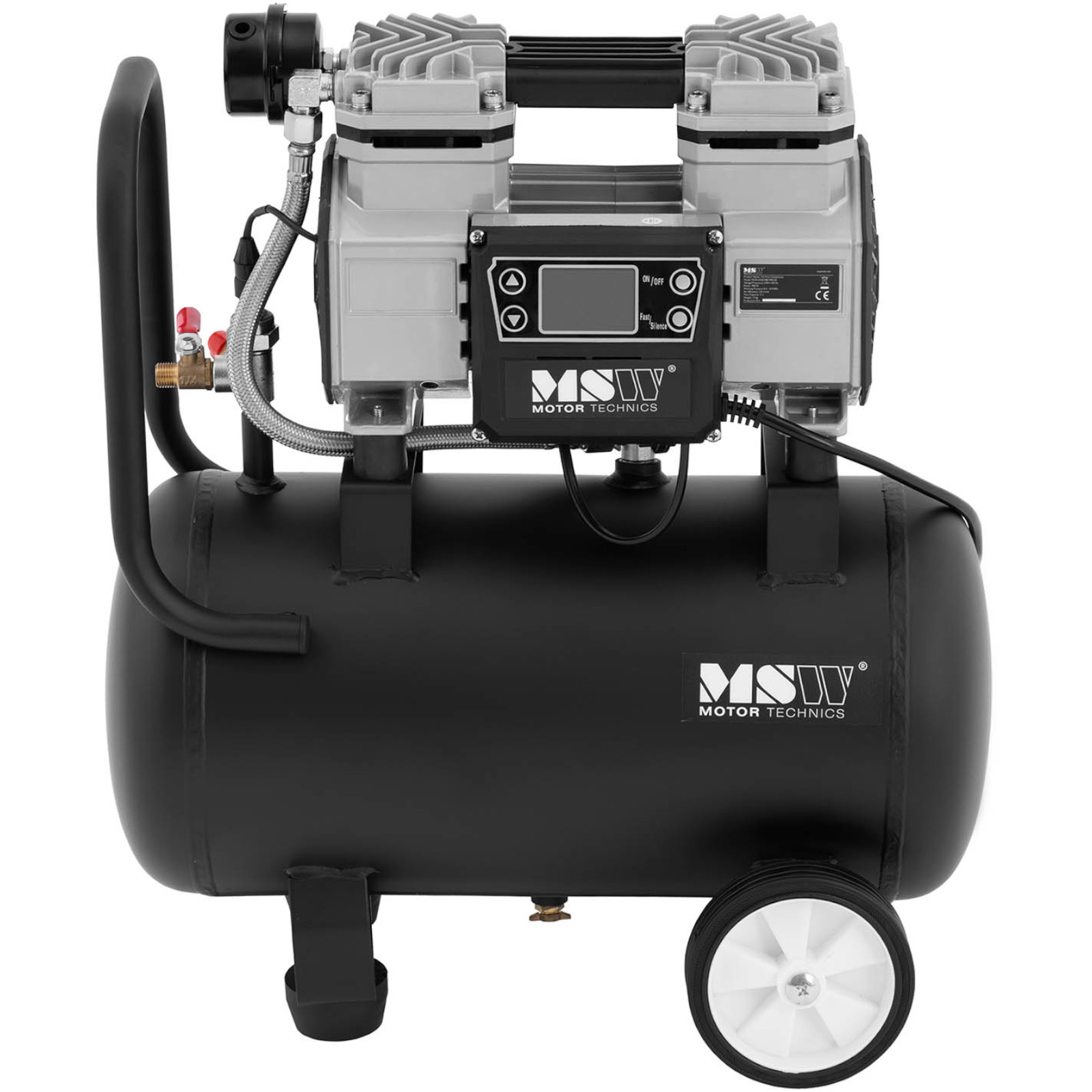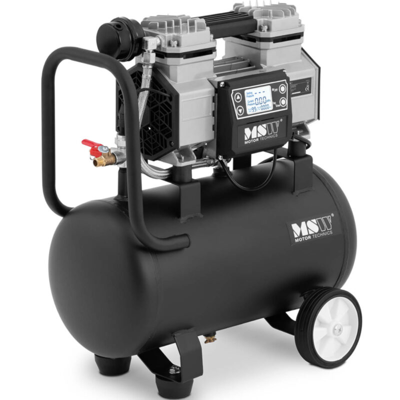Kompresor bezolejowy marki MSW o mocy 900 W i wydajności 125l/min z precyzyjnym sterowaniem to niezawodne i ciche urządzenie, które służy w sposób wszechstronny i mobilny aż do 24h. Sprawdzi się przy zmianie koła, remoncie, porządkach czy pracy z narzędziami pneumatycznymi. Wyświetlacz LCD pozwalana na precyzyjne ustawienia i wyraźny podgląd na parametry. Zbiornik kompresora wykonany jest ze stali i ma pojemność 17l, pozwala to osiągać niezbędne ciśnienie w bardzo krótkim czasie. Urządzenie jest w stanie utrzymywać ciśnienie na poziomie od 3 do 9 barów, po przekroczeniu wartości maksymalnej wyłącza się. W przypadku poziomu niższego niż minimum, sprzęt uruchomi się ponownie i zapewnia stabilne ciśnienie. Mobilna sprężarka wyposażona jest w dwa duże koła i uchwyt, jest dzięki temu łatwa w przenoszeniu.