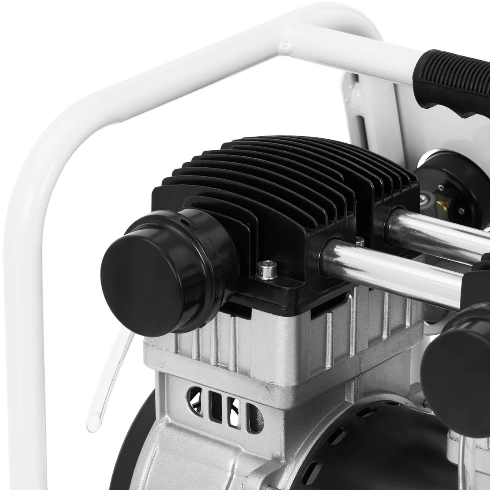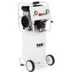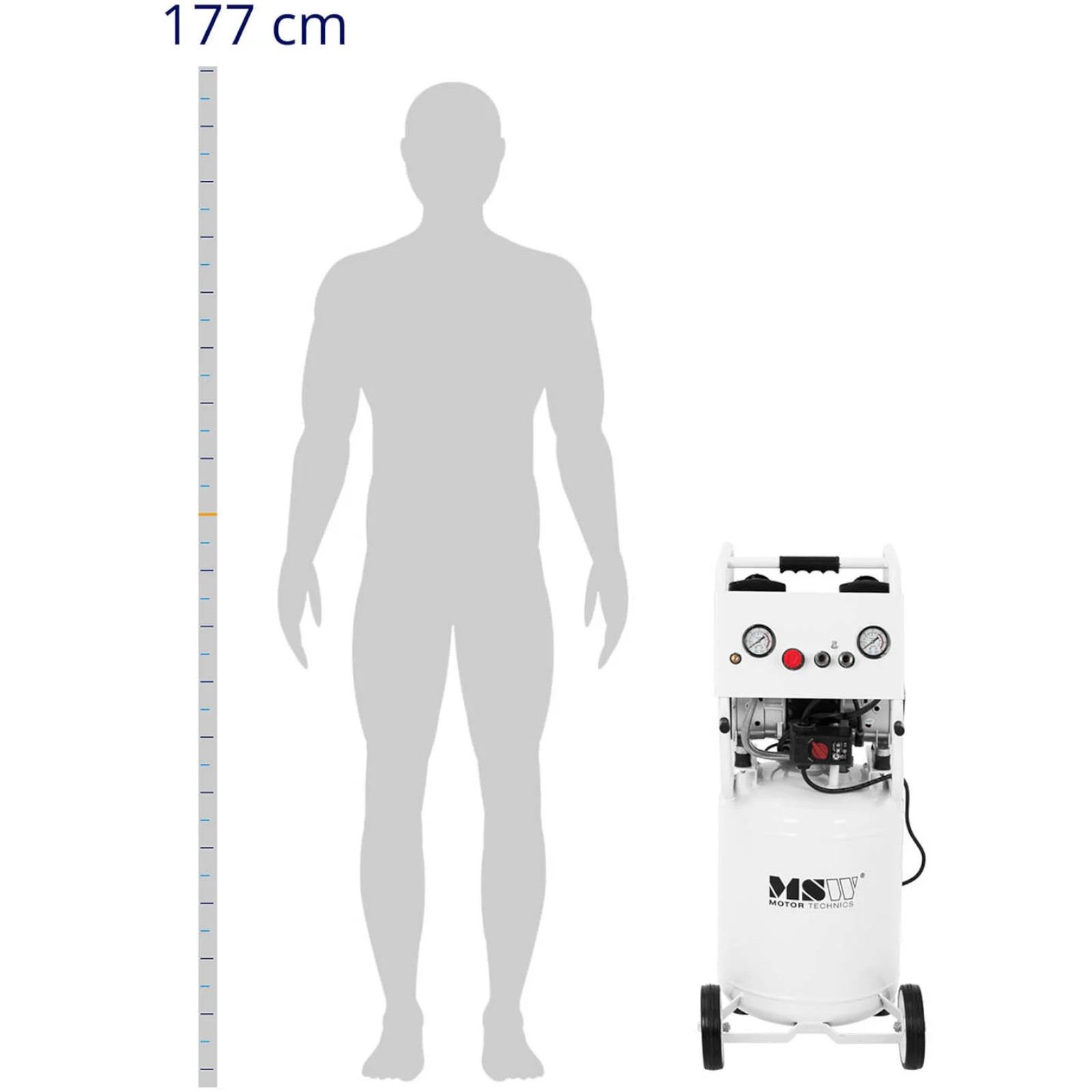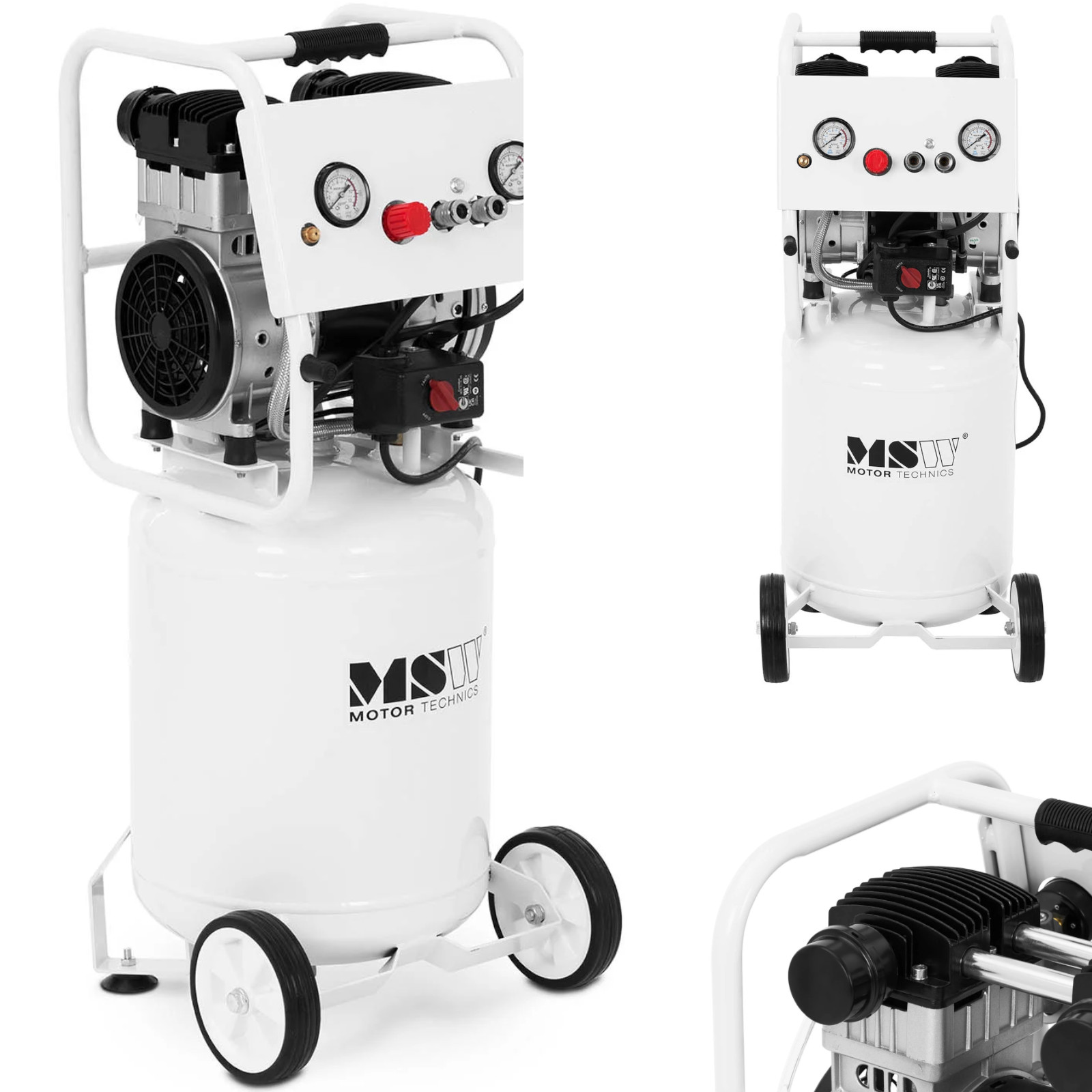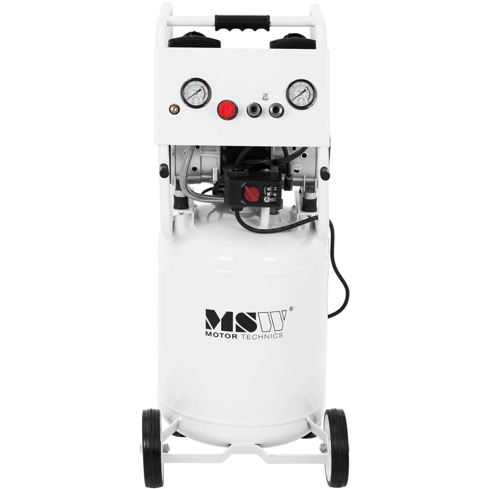 Bezolejowy kompresor marki MSW jest niezwykle uniwersalny. Nadaje się niezależnie od tego, czy pompuje się koła w warsztacie, czy napełnia balony powietrzem na imprezie. Duży zbiornik zapewnia ciągłe dostarczanie sprężonego powietrza, którego ciśnienie jest utrzymywane na optymalnym poziomie. Oznacza to, że zapewnia również napęd dla narzędzi pneumatycznych. Mobilna sprężarka powietrza jest wyposażona w dwa duże koła i uchwyt, dzięki czemu łatwo ją przenieść. Zbiornik kompresora ma pojemność 40 l i napełnia się go w zaledwie 120 s. Urządzenie utrzymuje ciśnienie sprężonego powietrza w zakresie 5 – 8 bar. Jeśli przekroczy ono maksimum, sprężarka wyłączy się. W przypadku poziomu niższego niż minimum, sprzęt uruchomi się ponownie i zapewni stabilne ciśnienie. Kompresor powietrza jest szczególnie skuteczny za sprawą mocy wyjściowej 1500 W i prędkości 1380 obr./min. Model ten jest wyjątkowo cichy. Emituje dźwięk na poziomie 68 dB. Sprężarka jest bezpieczna, ponieważ w każdej chwili można sprawdzić ciśnienie za pomocą dwóch manometrów. Posiada również zabezpieczenie przed przeciążeniem termicznym. Wbudowana pompa dwutłokowa zapewnia żywotność ponad 3000 godzin pracy, a tym samym oferuje około 10-krotnie dłuższy czas użytkowania w porównaniu do innych sprężarek powietrza.