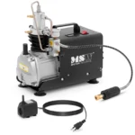 Za pomocą kompresora PCP marki MSW można nabić różne sprzęty sprężonym powietrzem, np. pistolety do paintballa czy wiatrówki. Równie szybko można napompować także koła czy pontony. Wydajną sprężarkę wykorzysta się również do gaszenia pożarów lub testowania szczelności pod ciśnieniem. Urządzenie zasilane jest  za pomocą gniazdka 230 V. Kompaktowa wysokociśnieniowa sprężarka PCP zapewni doskonałą wydajność. Kompresor pracuje przy ciśnieniu maksymalnym 300 bar. Potrzebuje on od 16 do 17 minut, aby napełnić zbiornik o pojemności 0,5 l do ciśnienia 300 bar. Wystarczy ustawić żądane ciśnienie na urządzeniu. Po osiągnięciu tej wartości należy ręcznie wyłączyć sprężarkę. Sprężarka działa wyjątkowo niezawodnie i bezpiecznie, ponieważ jest chłodzona wodą. Przy mocy silnika 1800 W uzyskuje przepływ powietrza na poziomie 50 l/min. Podczas napełniania kompresor osiągnie prędkość napełniania 2880 obr./min. Taka wydajność jest możliwa dzięki dwucylindrowej sprężarce o zwiększonej pojemności skokowej, która spełni każde wymagania w warsztatach lub podczas gaszenia pożarów. Za pomocą wyświetlaczy sprawdza się temperaturę i ustawione ciśnienie, dzięki czemu wszystkie parametry zawsze będą pod kontrolą. Prezentowanie temperatury roboczej w czasie rzeczywistym pozwoli bezpiecznie utrzymać jej poziom poniżej 70°C. Za pomocą szybkozłączki 8 mm można sprawnie podłączyć dyszę napełniającą do zbiorników. Gumowy wąż napełniający ma bardzo wszechstronne zastosowanie. Kompaktowe urządzenie wyposażono w praktyczny uchwyt, dzięki czemu można wykorzystać je również w podróży.