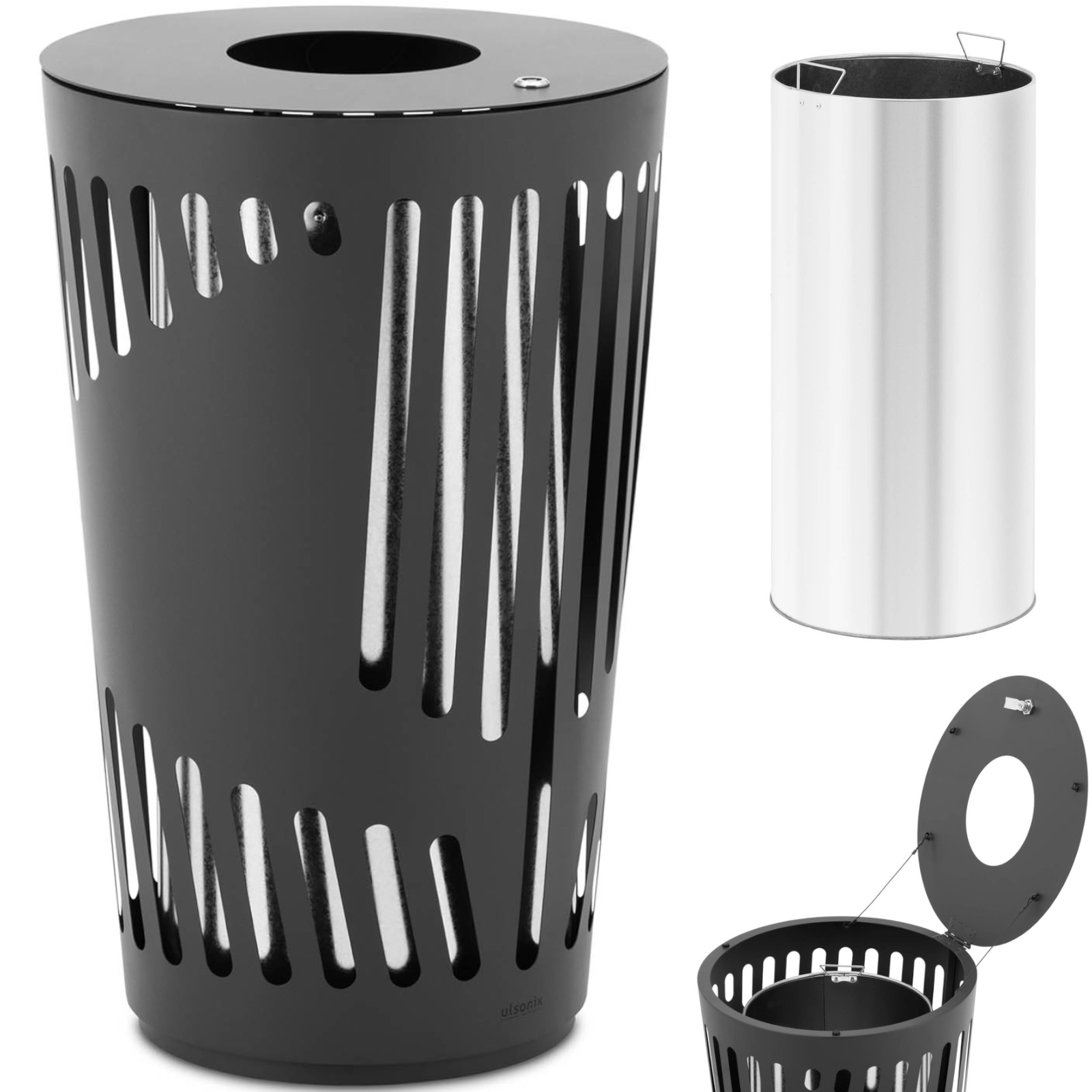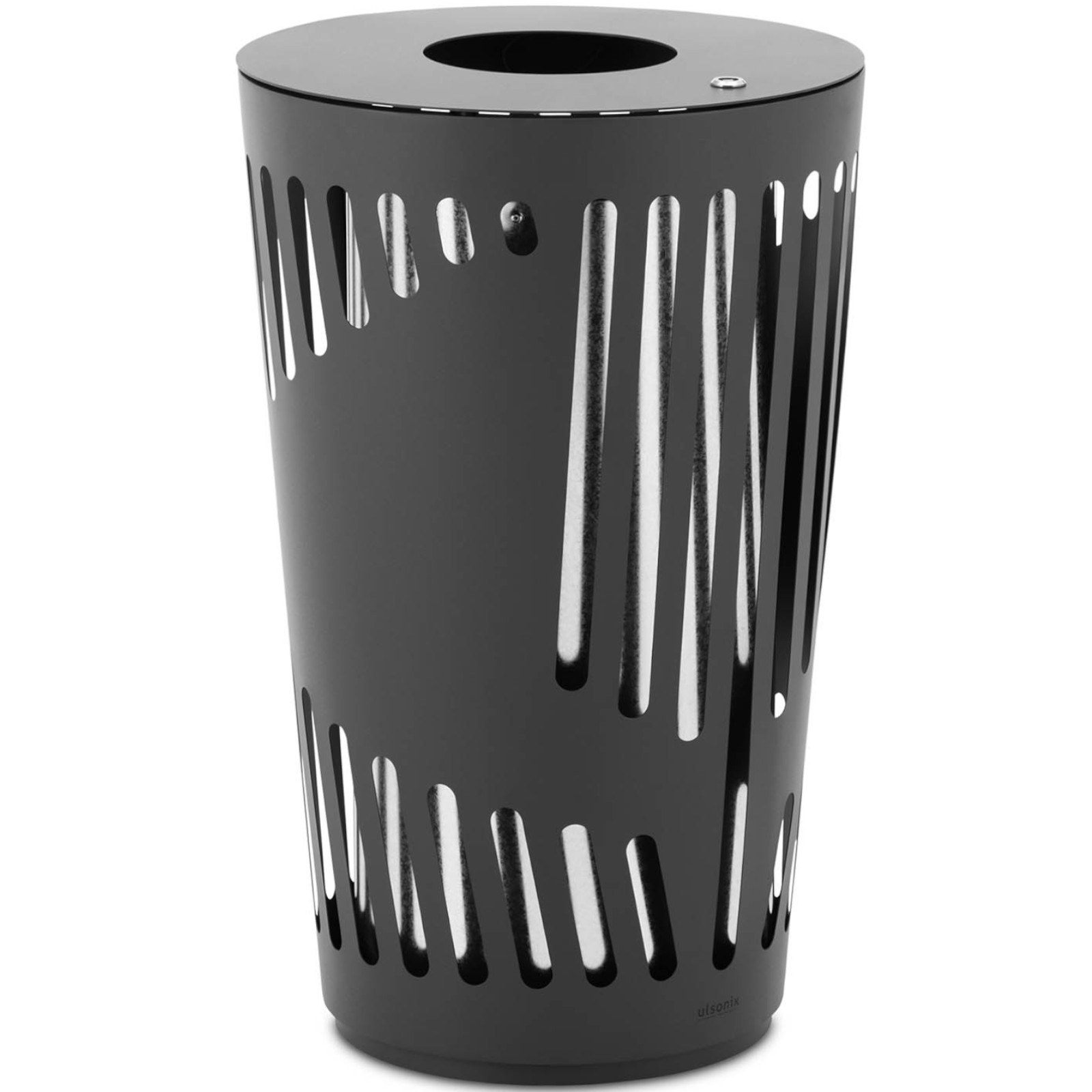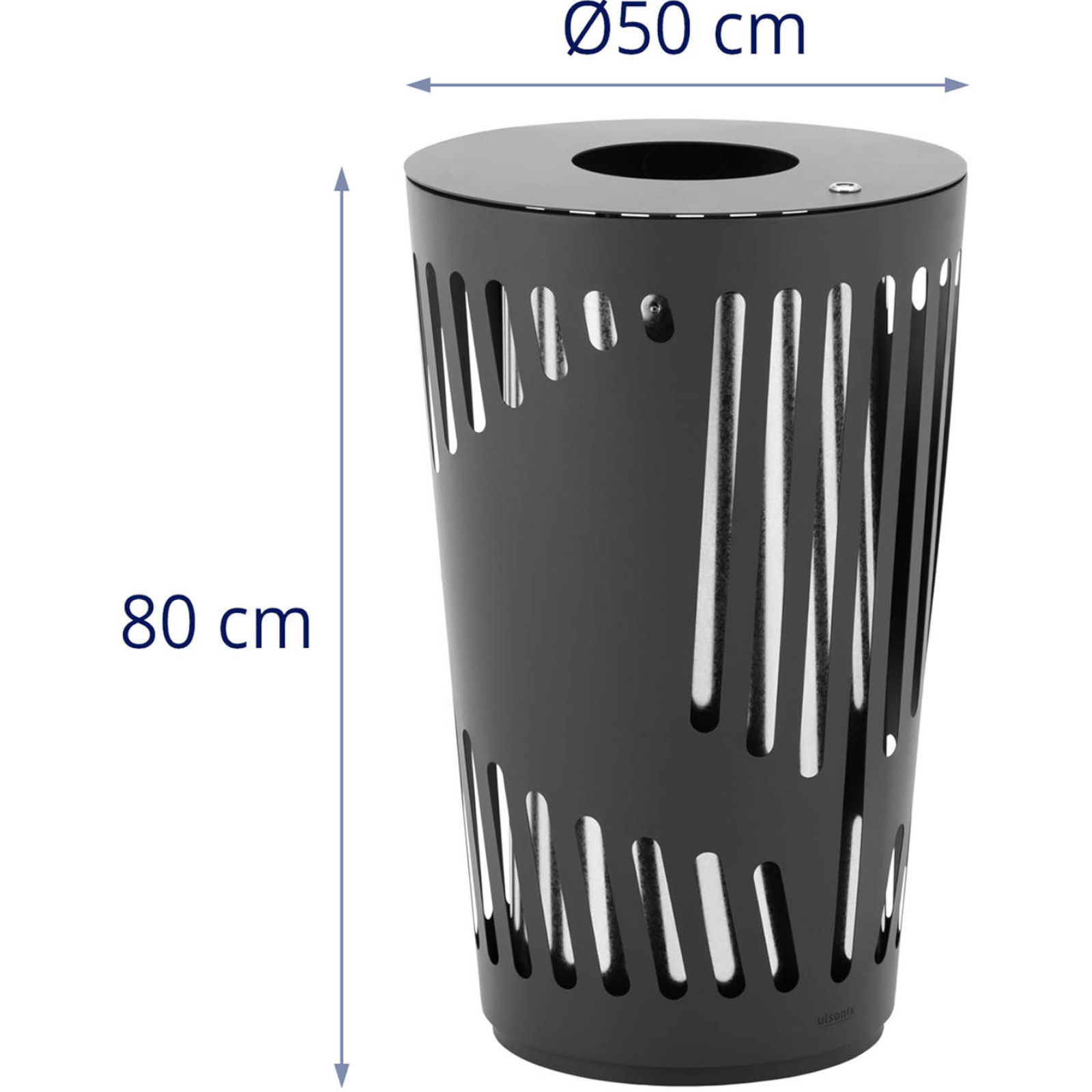 Kosz na śmieci marki Ulsonix sprawdzi się zarówno wewnątrz jaki i na zewnątrz pomieszczeń. Posiada okrągły kształt i elegancki wygląd. Średnica kosza wynosi 50 cm a jego wysokość 80 cm. Wykonany został z wysokiej jakości żelaza oraz stali ocynkowanej. Pokrywa ze zwężonym wlotem zapobiega zaglądaniu do środka i przyczynia się do zachowania estetycznego wrażenia. Kosz można przymocować do podłoża za pomocą śrub.