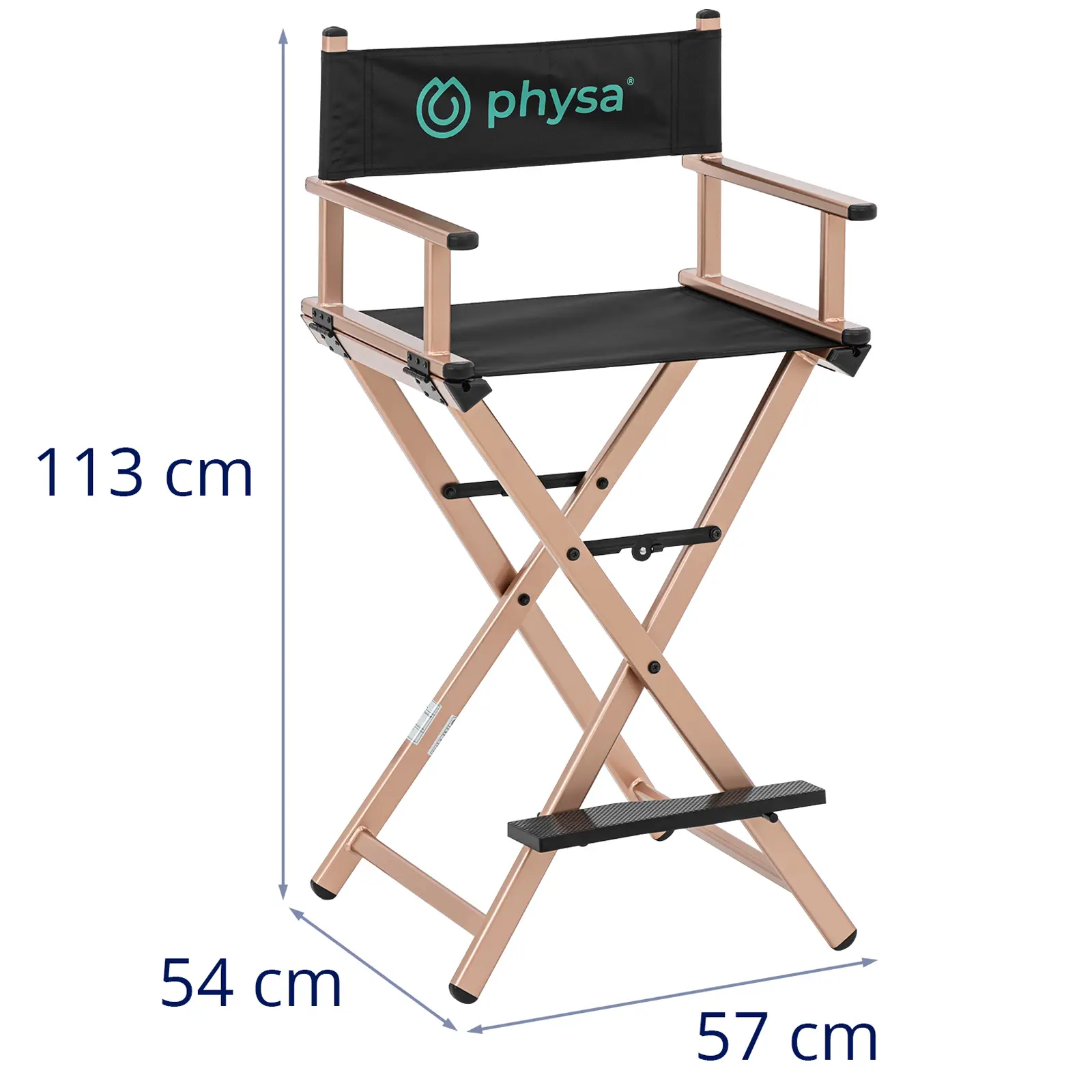 Krzesło marki Physa sprawdzi się zarówno w salonach kosmetycznych, studiach fotograficznych czy filmowych oraz za sprawą składanej konstrukcji w plenerze czy na targach. Jedną z głównych zalet krzesła do wizażu jest bez wątpienia jego komfort. Podnóżek oraz duże siedzisko (40 x 47 cm) zapewniają odpowiednią wygodę. Rama została wykonana z aluminium, siedzisko i oparcie z nylonu. Użyte materiały są odporne na zabrudzenia oraz łatwe w czyszczeniu.