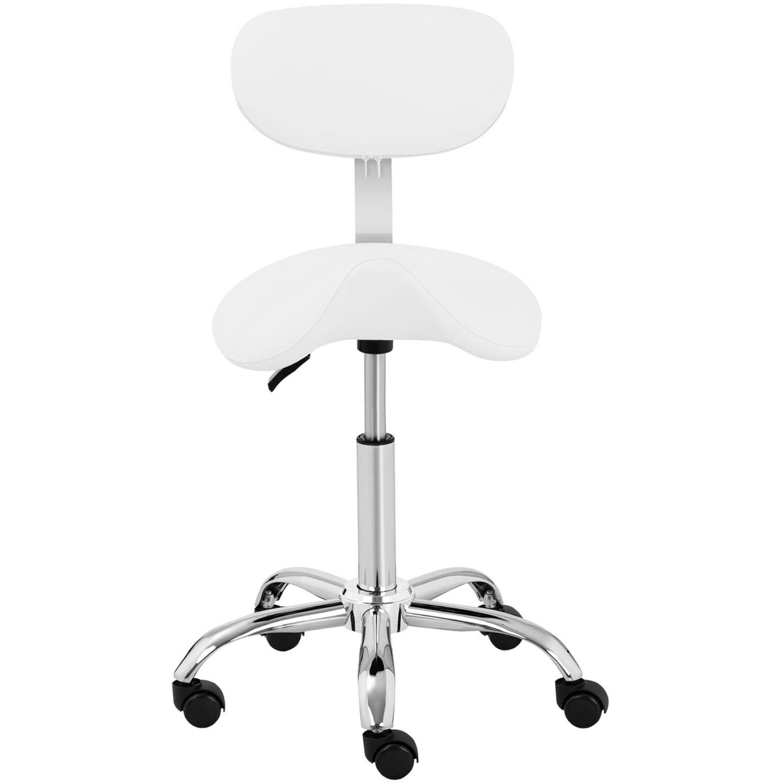 Krzesło siodłowe marki Physa przyda się w salonie kosmetycznym, fryzjerskim, centrach SPA, a także w prywatnym użytku. Siedzisko jest wygodne, ma kształt siodła i zostało wypełnione pianką tapicerską. Oparcie pleców zapewnia dodatkowy komfort. Tapicerkę wykonano ze skóry syntetycznej, jest elegancka, nie pochłania wody i olejków oraz łatwo się czyści. Wysokość krzesła regulowana jest do wzrostu użytkownika a opuszczanie i podnoszenie przebiega płynnie. 5- ramienna podstawa wyposażona została w 5 kółek, co ułatwia przemieszczanie. Stołek wykonany został ze stali chromowanej, wytrzymuje obciążenie do 150 kg.