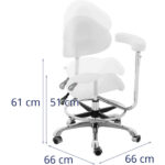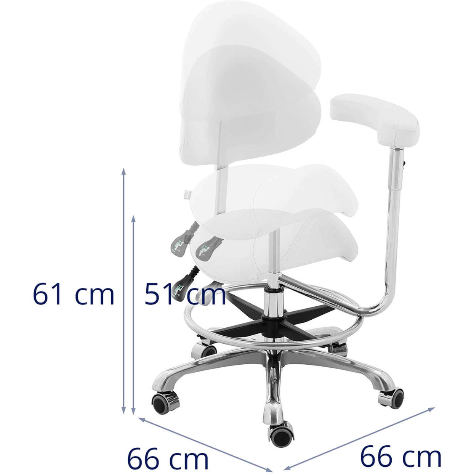 Krzesło siodłowe marki Physa z podłokietnikiem i oparciem będzie idealne w studiach tatuażu, ośrodkach SPA & Wellness oraz w domach lub biurach. Sprawdzi się szczególnie tam, gdzie wymaga się jednocześnie ustawienia wysokości i nachylenia, wygody i stabilności. Krzesło zapewnia znaczną mobilność nawet w ciasnych przestrzeniach. Nośność hokera to 150 kg. Mebel posiada oparcie, które można pochylić o 0-22° za pomocą dźwigni. Dzięki drugiej dźwigni oparcie ustawiane jest na wysokość 90-100 cm. Poduszka siedziska wypełniona pianką o grubości 5 cm pokryta jest skórą PVC i zapewnia dodatkowy komfort, podobnie jak wyściełany podłokietnik. Krzesło siodłowe wyposażono w podstawę z solidnymi 5 kółkami, które obracają się o 360°. Siedzisko także obraca się o 360°. Wysokość siedziska jest regulowana w zakresie 51-61 cm za pomocą dźwigni. Siedzisko przesuwa się płynnie w górę/dół dzięki sprężynie gazowej. Tapicerka ze skóry PVC jest bardzo łatwa w pielęgnacji. Nie wchłania płynów i kurzu. Wysokiej jakości materiały zapewniają solidną konstrukcję. Połączenie stali i eleganckiego obicia gwarantuje również stylowy oraz atrakcyjny wygląd.