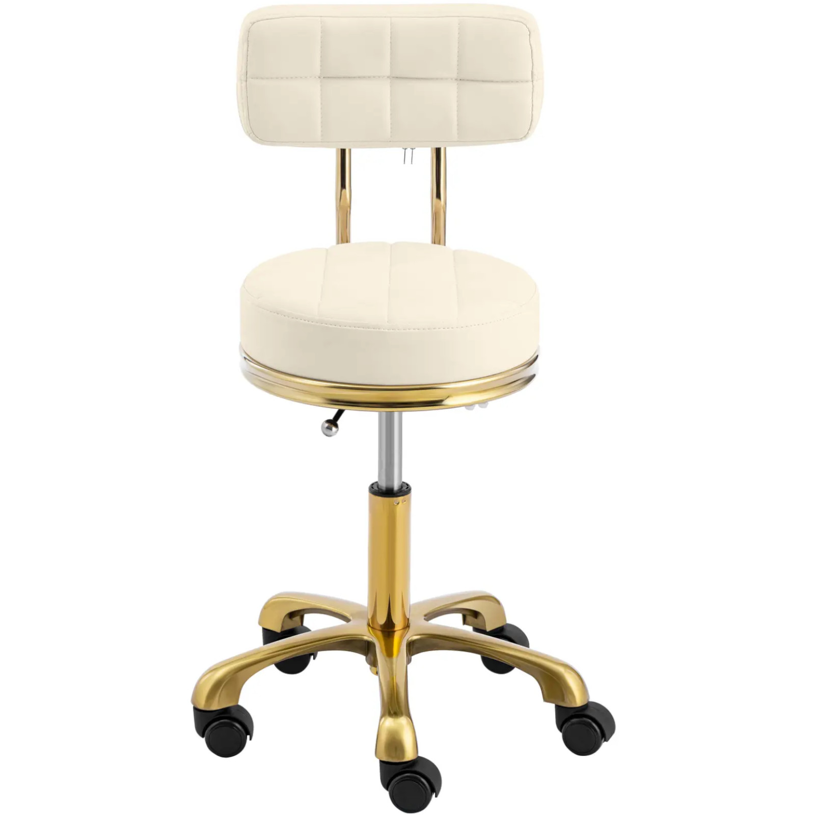 Taboret kosmetyczny GELA BEIGE marki physa sprawdzi się w salonie fryzjerskim, gabinecie kosmetycznym czy lekarskim podczas pracy. Jego funkcjonalny design i subtelny kolor pasują do niemal każdego wystroju. Taboret można swobodnie przestawić w dowolne miejsce za sprawą pięciu lekkobieżnych kółek. Wysokość siedziska ustawia się za pomocą sprężyny gazowej w zakresie 51 – 66 cm. W razie potrzeby można obrócić krzesło o 360° wokół własnej osi. Na tapicerowanym siedzisku o średnicy 35 cm można wygodnie siedzieć nawet przez długi czas. Stołek imponuje solidną konstrukcją, która zniesie obciążenie do 150 kg. Zastosowane materiały, takie jak syntetyczna skóra PVC i stop aluminium, są łatwe do czyszczenia. Dodatkowo tapicerka siedziska jest odporna na kurz i wodę, co oznacza, że podczas pracy taboret kosmetyczny brudzi się w niewielkim stopniu.