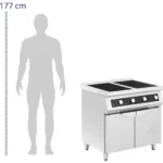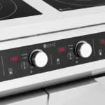 Kuchnia indukcyjna marki Royal Catering sprawdzi się w każdej profesjonalne kuchni. Cewka przewodząca prąd pod powierzchnią grzewczą wytwarza zmienne pole magnetyczne, co sprawia, że nagrzewają się tylko garnki i patelnie. Sama kuchenka pozostaje chłodna. Dzięki mocnym palnikom i otwartej konstrukcji z miejscem do przechowywania urządzenie doskonale pasuje do wszystkich typów profesjonalnych kuchni. Indukcja grzeje wydajniej niż prąd czy gaz. Specjalna technologia pozwala zaoszczędzić dużo czasu podczas gotowania, a jednocześnie zmniejsza zużycie energii i rachunki za prąd. Jej obsługa jest prosta i intuicyjna. Pokrętła z przodu kuchenki ustawiają żądaną temperaturę w zakresie 60 – 240°C. 4 palniki o średnicy 16-30 cm mają moc 17000 W (2 x 5000 W i 2 x 3500 W). Dzięki temu kuchnia indukcyjna osiąga temperaturę roboczą w możliwie najkrótszym czasie. Płyta nadają się do garnków i patelni o wadze 25 kg. Wysokiej jakości urządzenie jest przeznaczone do ciągłego użytku w branży HoReCa, np. w restauracjach i hotelach. Obudowę kuchenki wykonano ze stali nierdzewnej, higienicznej, łatwej w czyszczeniu i trwałej. Materiał jest równie łatwy w czyszczeniu jak płyta grzewcza. Cechuje się też wysoką trwałością i odpornością na korozję. Pod płytą znajduje się również dodatkowe miejsce do przechowywania.