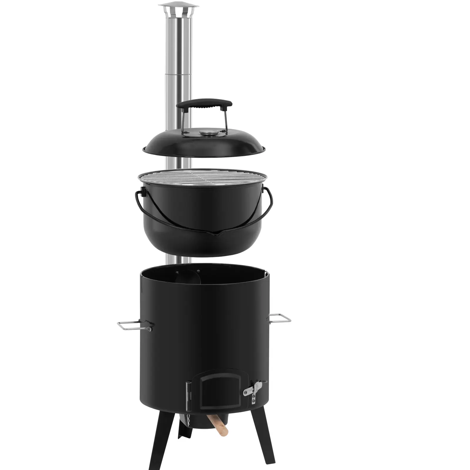 Wielofunkcyjny kociołek z paleniskiem marki Royal Catering sprawdzi się do gotowania na świeżym powietrzu takich potraw jak gulasze, zupy, pieczone kasztany i inne pyszne dania. Kociołek myśliwski przyda się na przyjęciach w ogrodzie, imprezach firmowych, festiwalach, piknikach lub biwakach. Opalany jest drewnem lub węglem drzewnym, jest naprawdę wszechstronny. Szeroka gama akcesoriów pozwala gotować na wiele różnych sposobów. W kociołku można przyrządzić zupy, syte gulasze mięsne lub grzane wino. Dołączona chochla łatwo porcjuje danie. Kuchnia polowa pozwala zrobić też pyszne dania z grilla, a dzięki patelni – aromatyczne kasztany. Kompaktowa konstrukcja nagrzewa się szybko i wydajnie. Ciepło jest równomiernie rozprowadzane w owalnym garnku, dzięki czemu skraca się czas. Analogowy termometr został umieszczony w pokrywie, aby kontrolować proces i wprowadzać zmiany bez otwierania i utraty ciepła. Wyjątkowo długa rura kominowa z osłoną przeciwdeszczową bezpiecznie kieruje dym i opary z dala od płyty grzewczej. Czyszczenie kociołka z paleniskiem jest również bardzo łatwe. Szerokie uchwyty pozwalają bezpiecznie wyjąć garnek. Ruszt do grillowania i brytfannę również wyjmuje się z obudowy. Popiół zbiera się w oddzielnym pojemniku z solidnym drewnianym uchwytem.