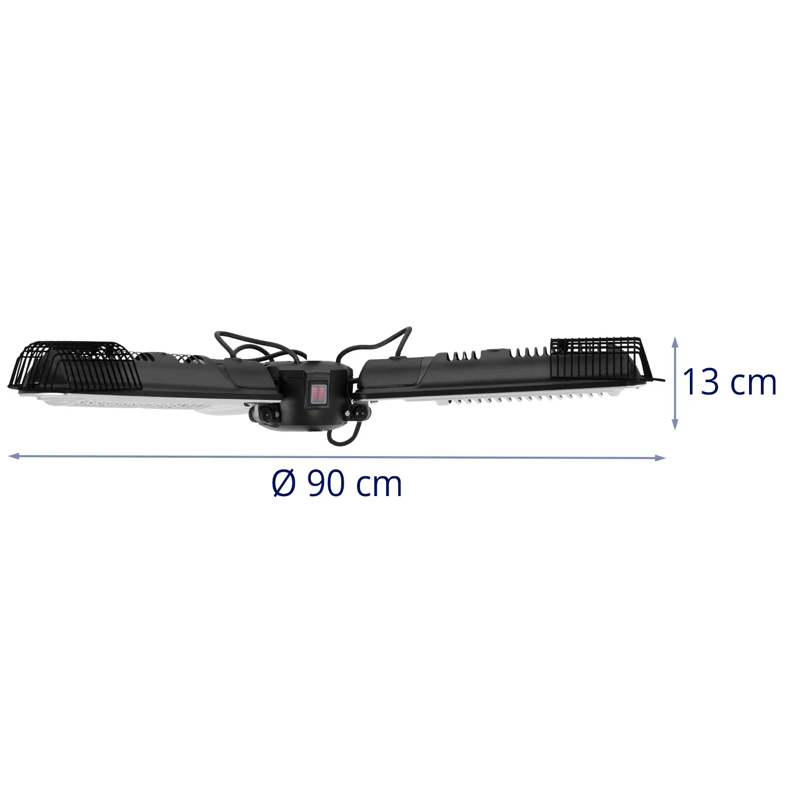 • – Kratka ochronna ogrzewacza na podczerwień zapobiega przypadkowemu kontaktowi z grzałką, a stopień ochrony IP44 pozwala zawiesić lampę IR na zewnątrz.