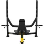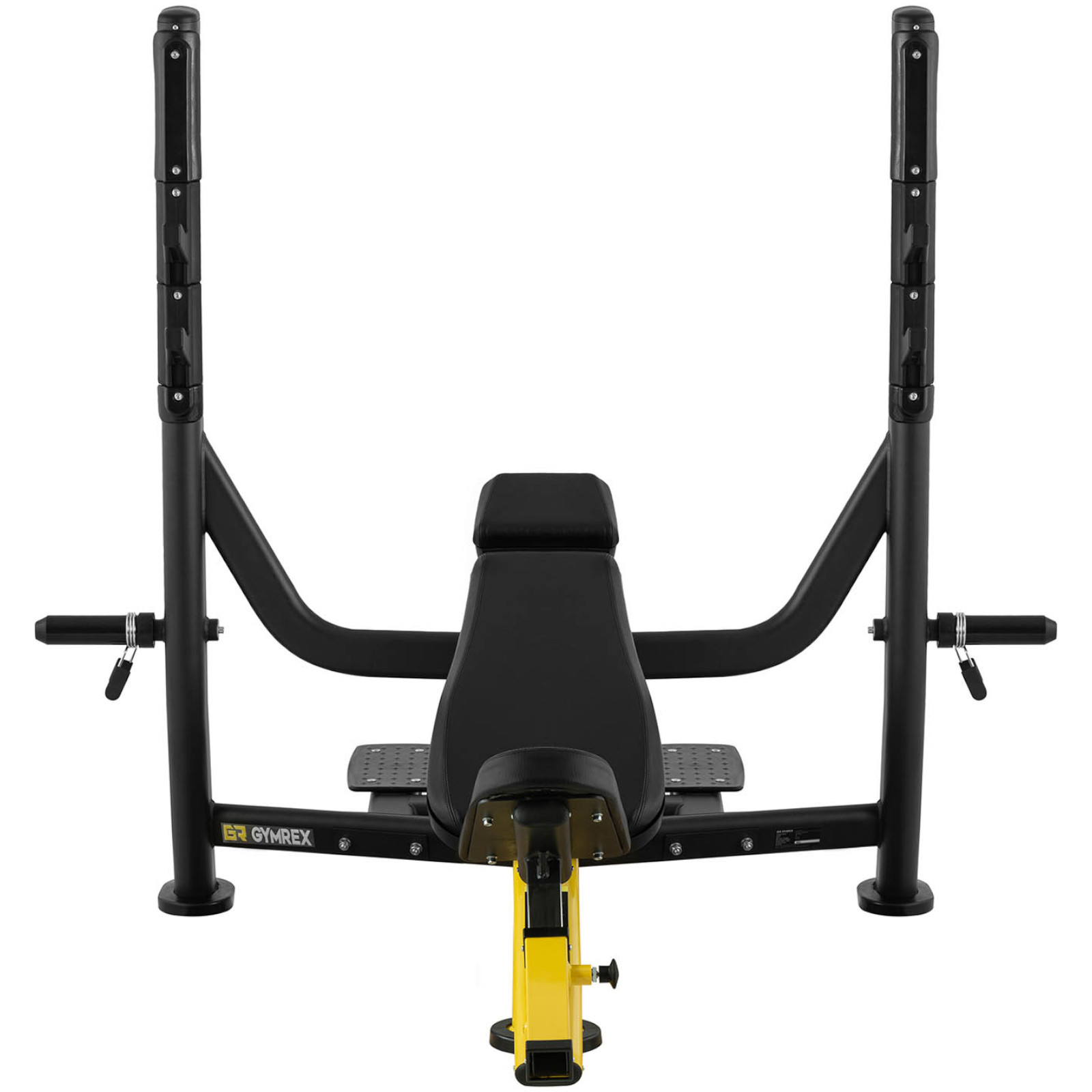 Ławka skośna do wyciskania głową w górę marki Gymrex idealnie sprawdzi się w studiu fitness lub domowej siłowni. Konstrukcja została wykonana ze stali malowanej proszkowo. Ławka olimpijska jest niezwykle stabilna i może wytrzymać maksymalny ciężar użytkownika do 135 kg. Natomiast maksymalna ładowność sztangi wytrzyma obciążenie do 200 kg. Dodatkowo uchwyty na sztangę znajdują się na ergonomicznej wysokości. Siedzisko ławki do wyciskania jest wykonane z pianki wyściełanej skórą PU i pozwala wygodnie ułożyć się podczas treningu.