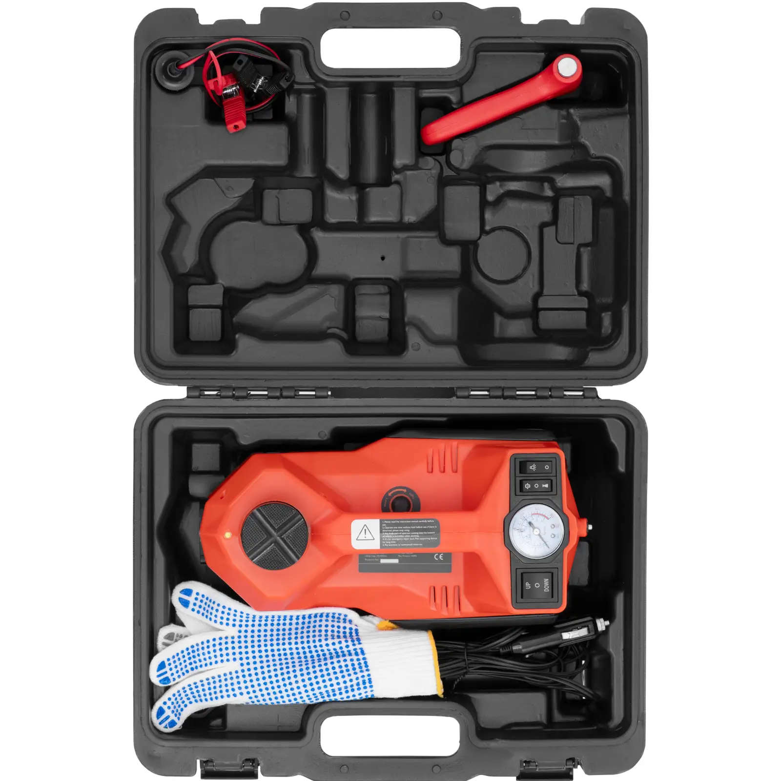 Elektryczny podnośnik samochodowy marki MSW pozwoli bezpiecznie podnieść auto w sytuacji awaryjnej. Dostarczany jest w zestawie, który składa się z podnośnika, kompresora powietrza, młotka zabezpieczającego, rękawic i innych akcesoriów. Za pomocą wielofunkcyjnego narzędzia wygodnie można zmienić koło na poboczu drogi lub parkingu. Praktyczna walizka transportowa i kompaktowe wymiary lewarka sprawiają, że zestaw jest idealny dla mechaników amatorów oraz pracowników pomocy drogowej lub mobilnego serwisu naprawczego. Dzięki podnośnikowi praca będzie szczególnie wydajna, ponieważ urządzenie jest szybko gotowe do użycia. Trójkąt ostrzegawczy jest przymocowany z tyłu obudowy, dzięki czemu przejeżdżający kierowcy wyraźnie widzą, gdzie stoi pojazd. Podnośnik samochodowy podłącza się do gniazdka zapalniczki za pomocą adaptera 12 V. Można też użyć akumulatora samochodowego. W zestawie znajdują się odpowiednie klemy. Po naciśnięciu jednego przycisku podnosi pojazdy o masie całkowitej do 5 ton. Duży udźwig zapewnia wystarczającą swobodę podczas prac konserwacyjnych w różnych autach. Podnośnik samochodowy osiąga wysokość do 45 cm. Ostatnie kilka centymetrów podkręca się ręcznie. Urządzenie posiada zawór bezpieczeństwa, za pomocą którego ręcznie opuszcza się śrubę podporową za pomocą dołączonego klucza imbusowego. Ponadto, dzięki dołączonemu kompresorowi, można wykorzystać podnośnik do pompowania powietrza, zapewniając w ten sposób optymalne ciśnienie w oponach. Zintegrowany manometr pozwala na bieżąco kontrolować ciśnienie robocze. Dodatkowo diody LED na urządzeniu świecą się podczas jego pracy. Wydajna sprężarka imponuje przepływem powietrza na poziomie 35 l/min. Wszystkie akcesoria można przechować w praktycznej walizce. Dzięki wgłębieniom na podnośnik, młotek itp. nie trzeba się martwić, że elementy zestawu będą porozrzucane w środku. Futerał bezpiecznie utrzymuje wszystkie części, chroni je przed brudem, wilgocią i kurzem oraz ułatwia transport całości. Dzięki kompaktowym wymiarom elektryczny podnośnik samochodowy z akcesoriami nadaje się do każdego pojazdu.