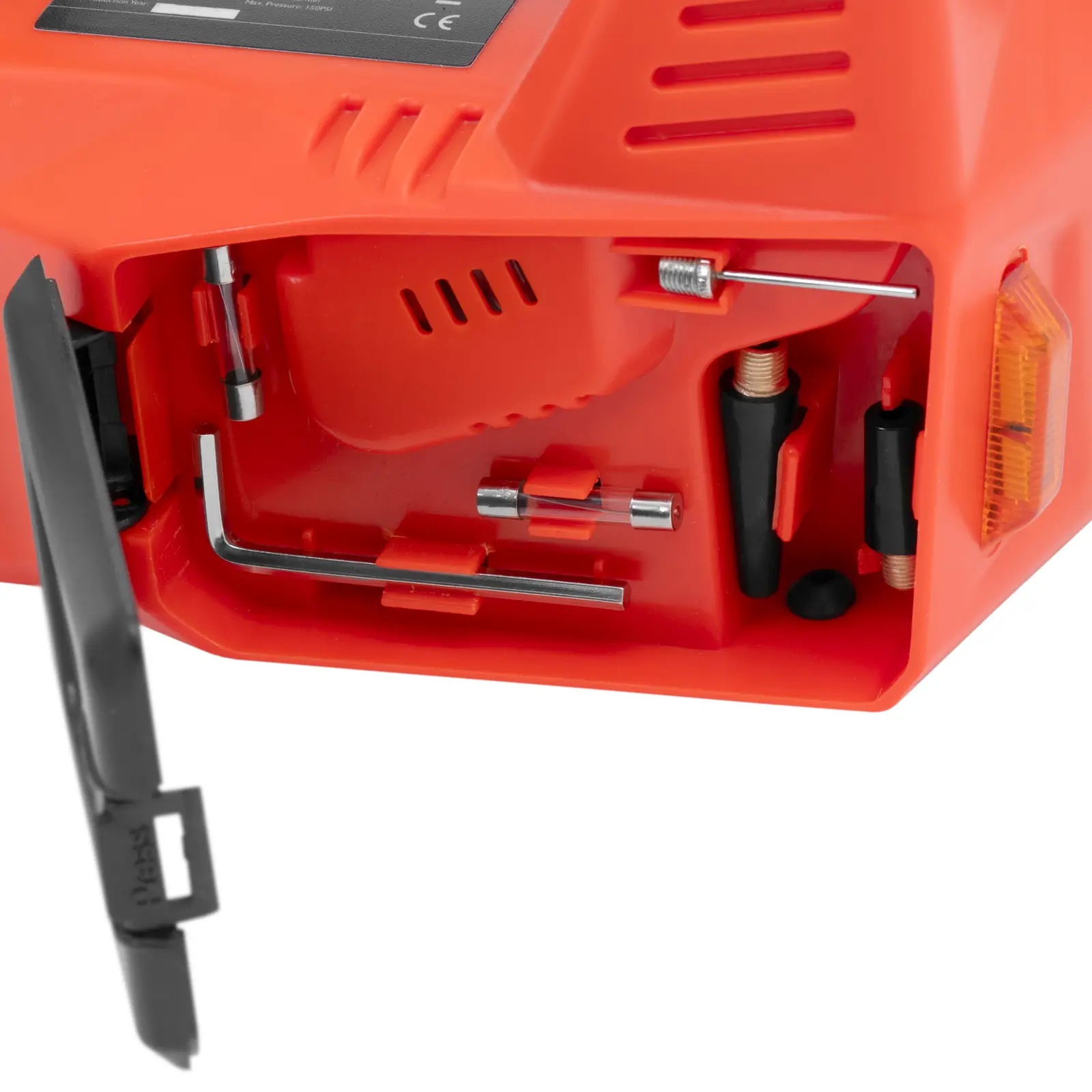 • – Zawiera młotek bezpieczeństwa, igły/adaptery do pompowania, zapasowe bezpieczniki i klucz imbusowy,