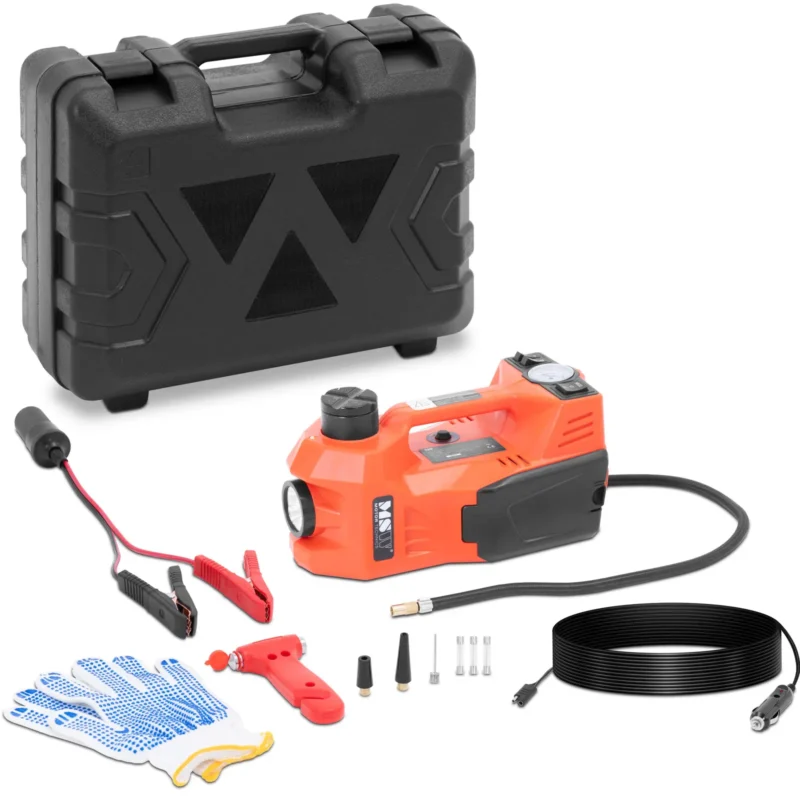 • – Eelektryczny podnośnik samochodowy z różnymi narzędziami do podnoszenia, pompowania i serwisowania kół w przypadku awarii,